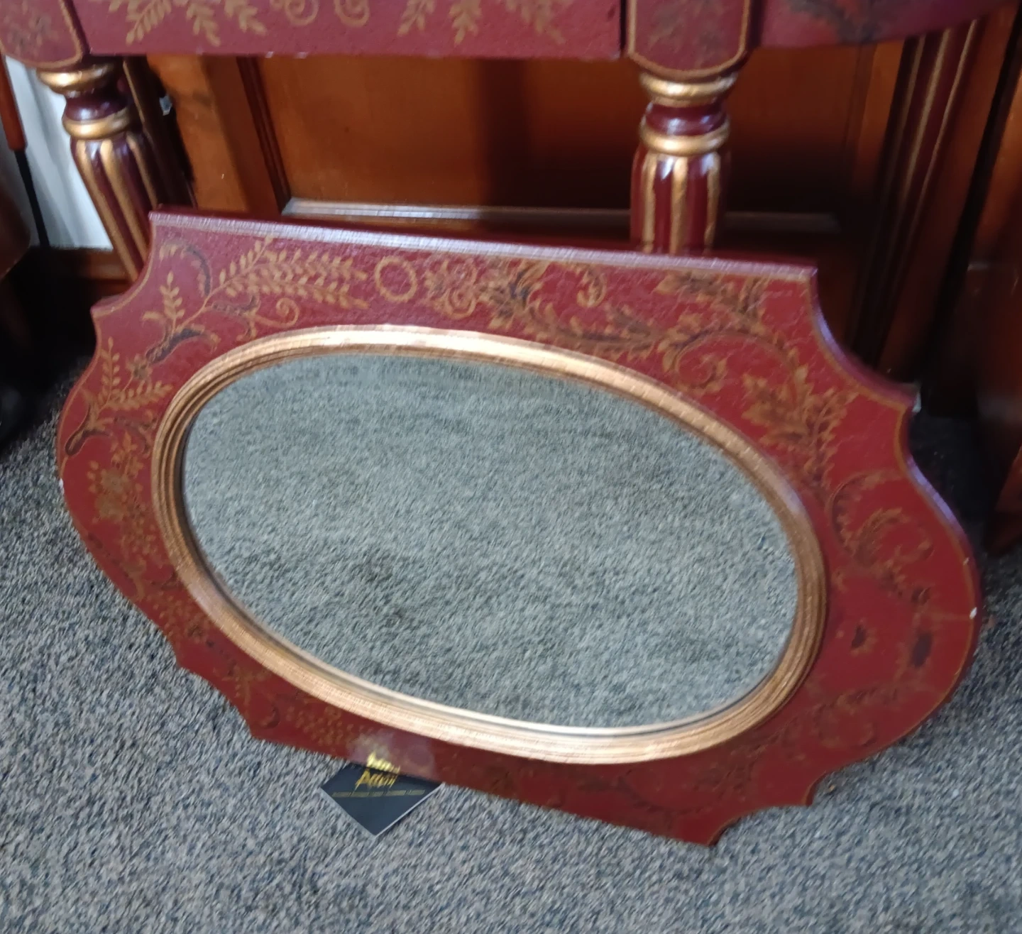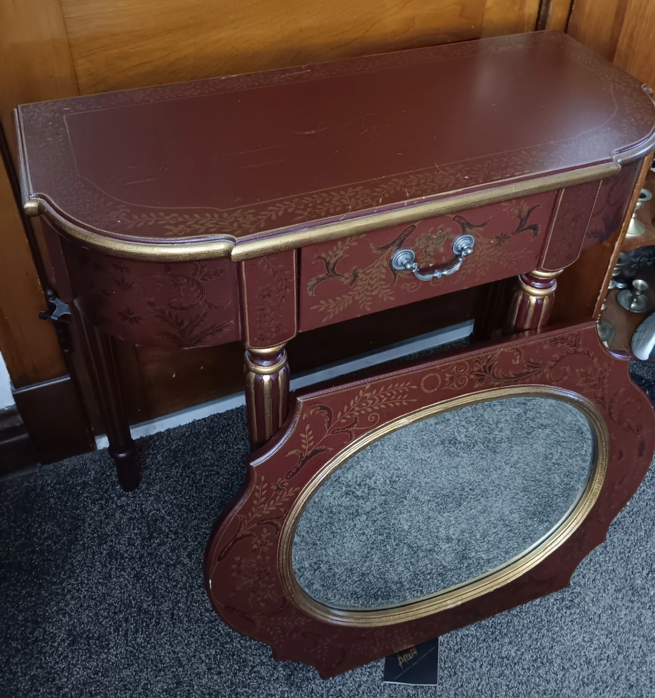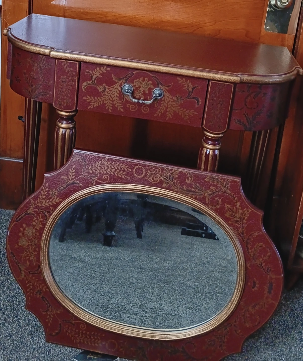 Selling a accent table with a matching mirror! The table features a single drawer with a decorative pull. The set is decorated with gold accents and floral patterns.