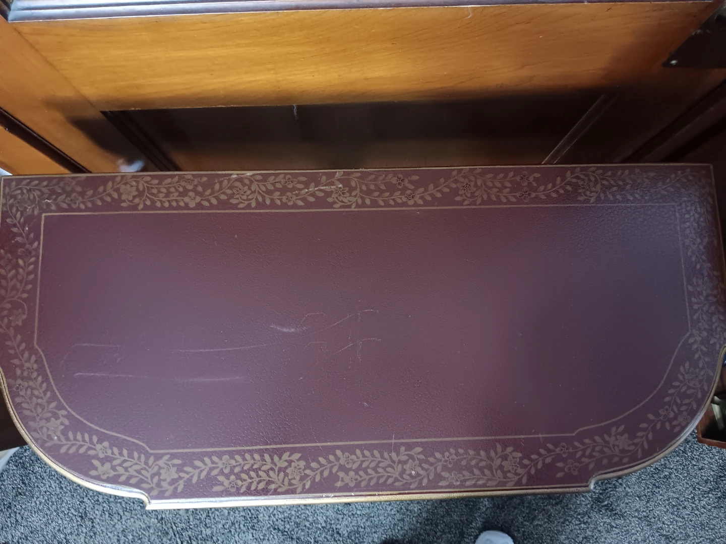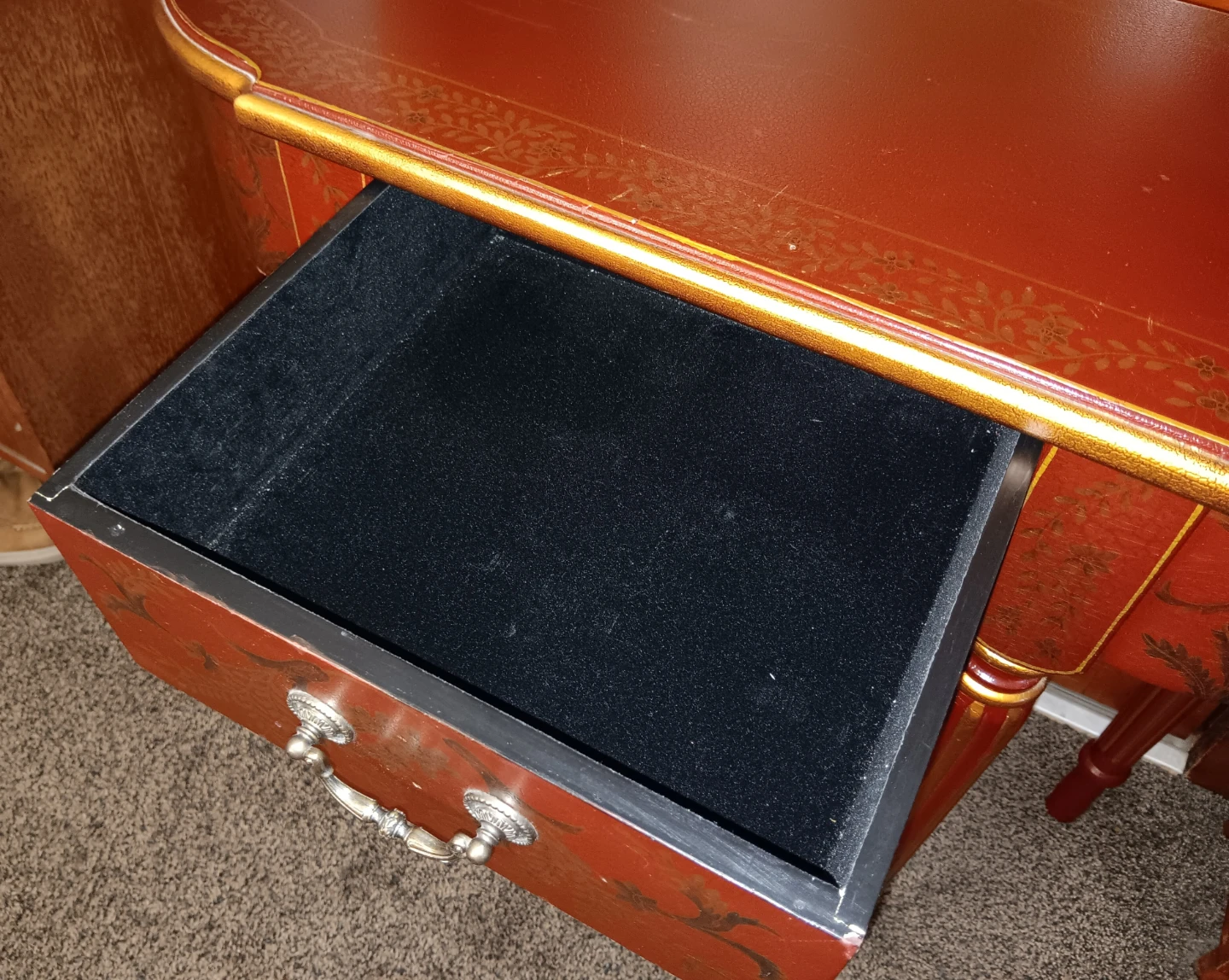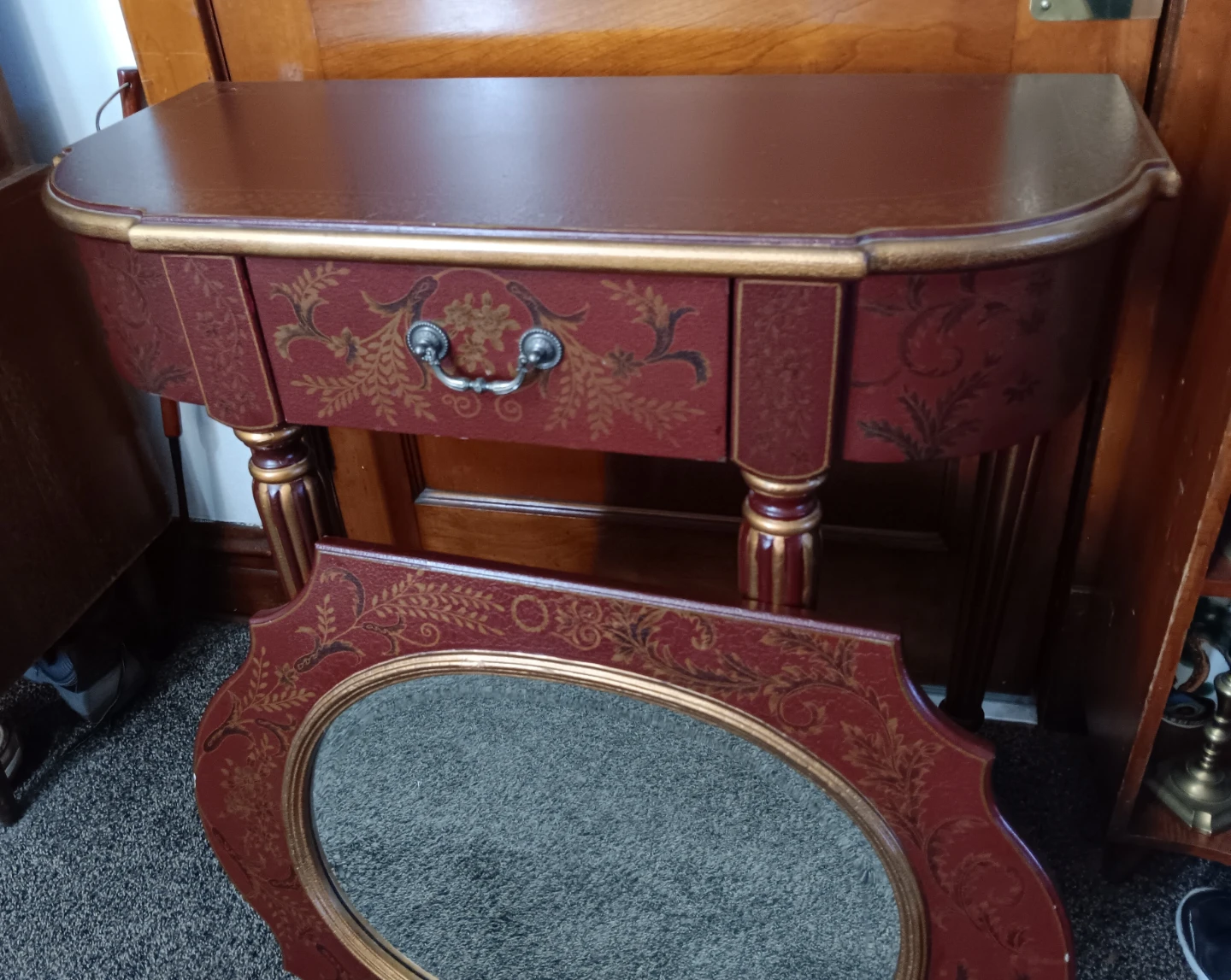 Selling a accent table with a matching mirror! The table features a single drawer with a decorative pull. The set is decorated with gold accents and floral patterns.