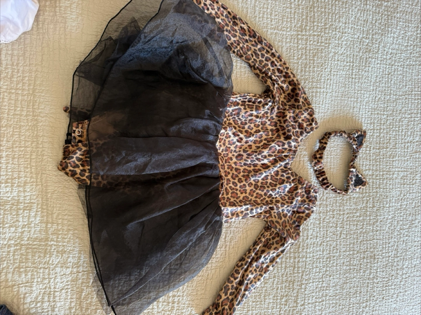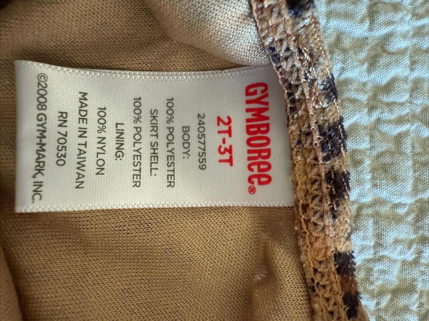 Cute Gymboree dress in size 2T-3T. The dress features a fun leopard print on the body and a black tulle skirt. It's made of 100% polyester with a 100% nylon lining. Perfect for your little one!
