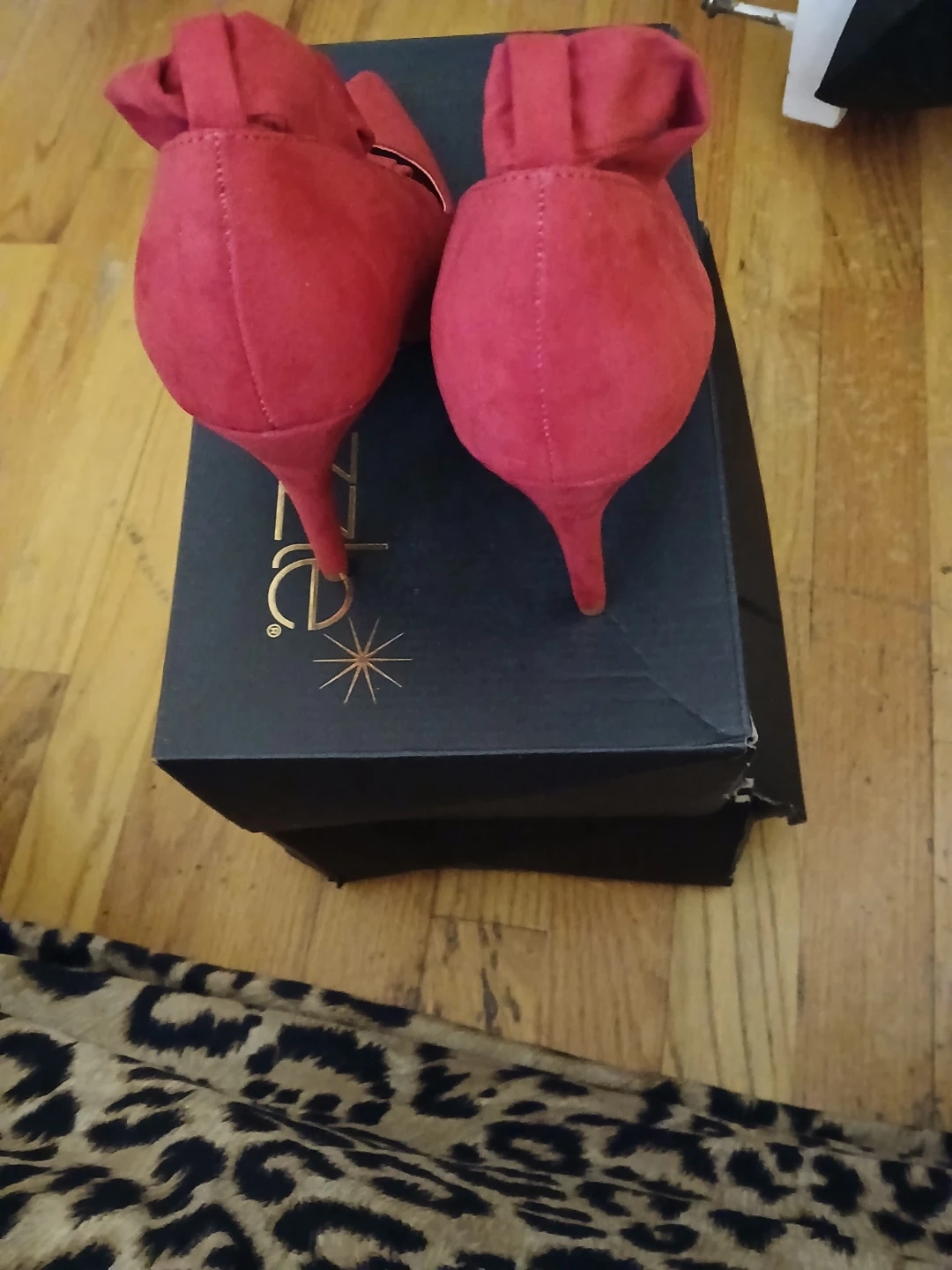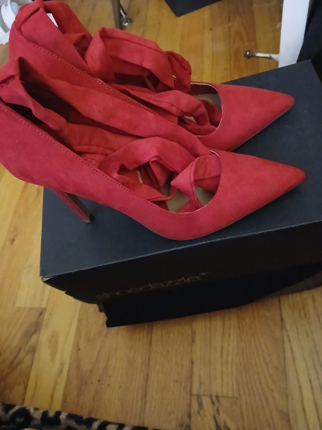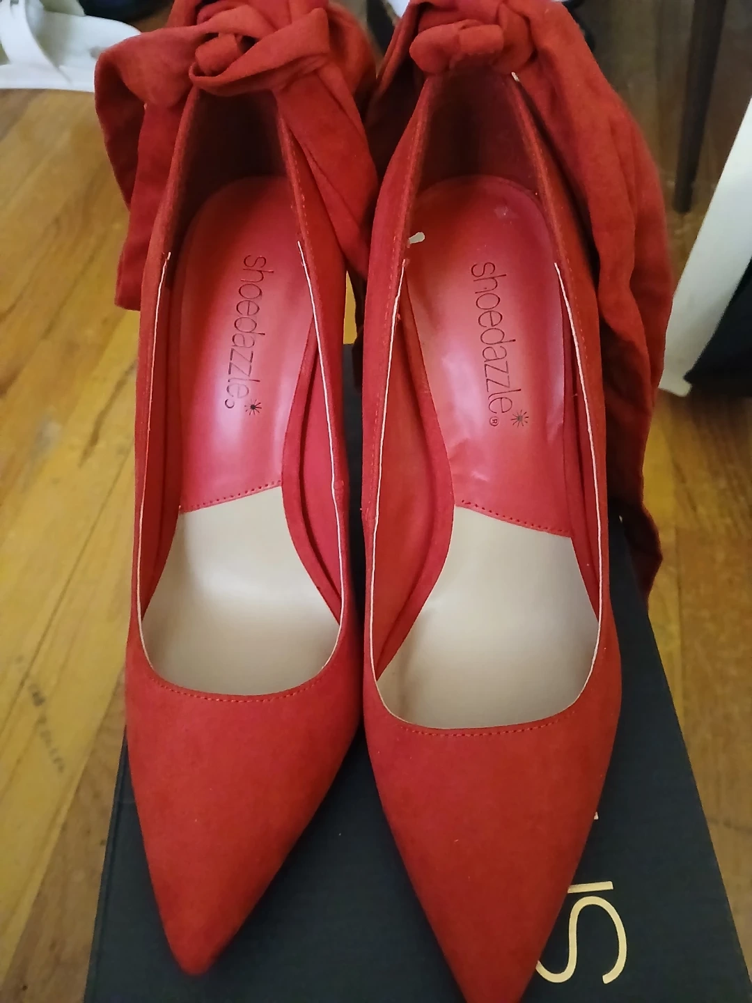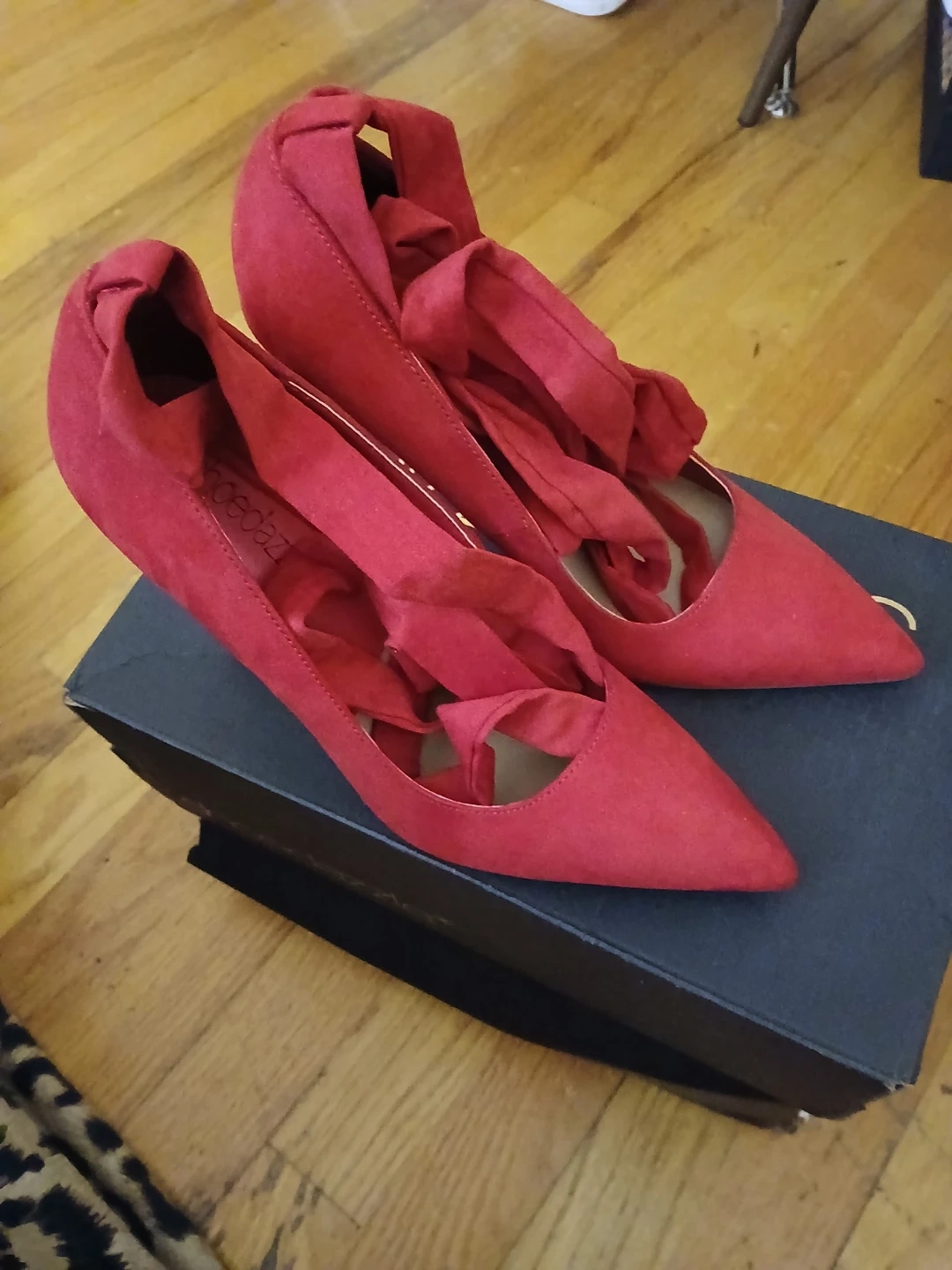 Chili pepper red suede pumps from ShoeDazzle with wrap-around straps. Pointed toe design. Perfect for dressing up any outfit!