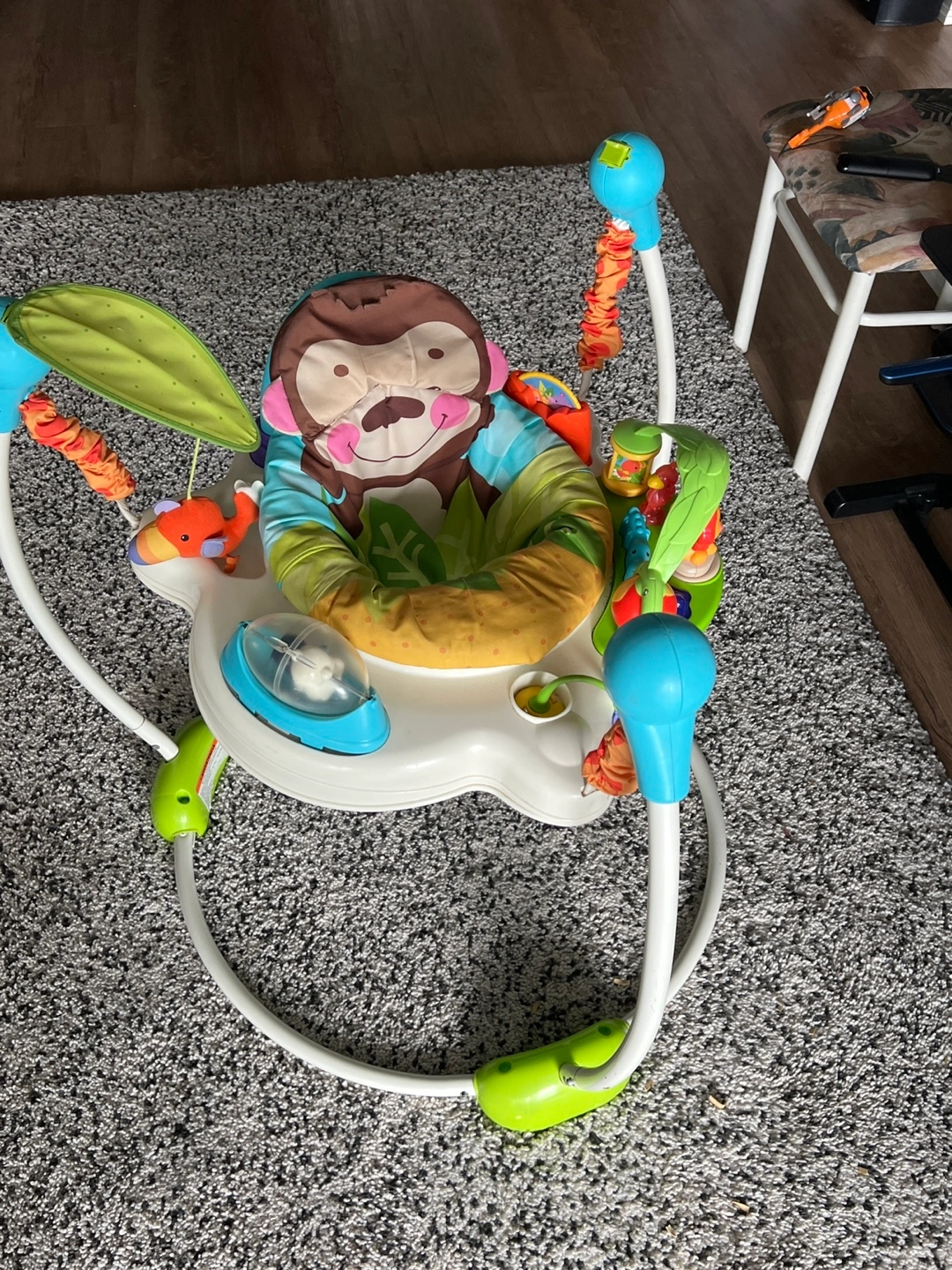 Adorable monkey-themed baby jumperoo. Features a comfy seat, engaging toys, and adjustable height. Great for encouraging your little one's motor skills and coordination. Suitable for babies who can support their own head and torso.