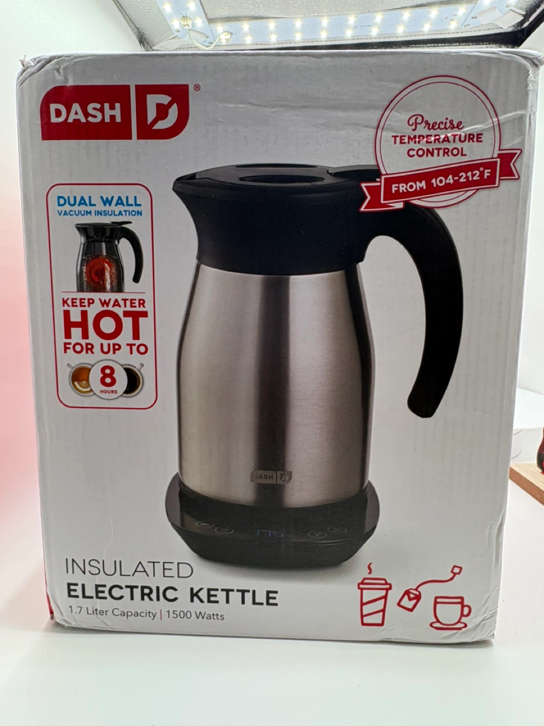I'm selling a Dash insulated electric kettle! It's a 1.7-liter capacity kettle with 1500 watts. The digital display shows the exact water temperature using a sensor on the kettle's interior. It also has a keep warm function that holds water at any temperature, and the kettle retains heat for hours after disconnecting. It has dual wall vacuum insulation and keeps water hot for up to 8 hours. Includes precise temperature control from 104-212°F. The box is included!