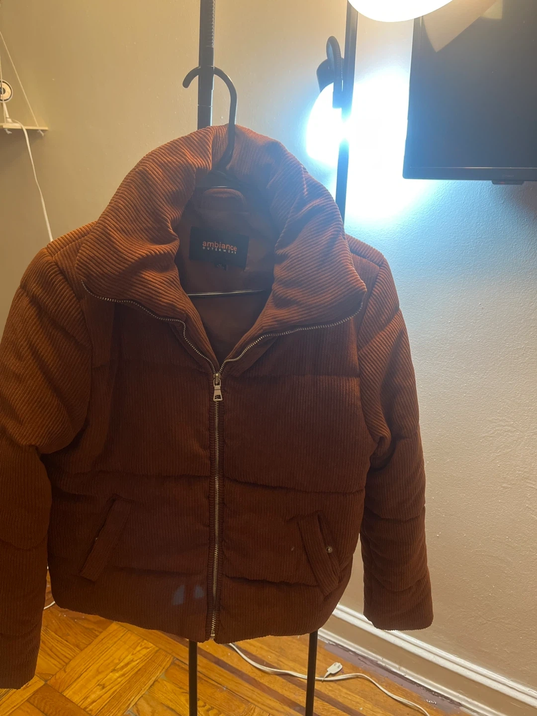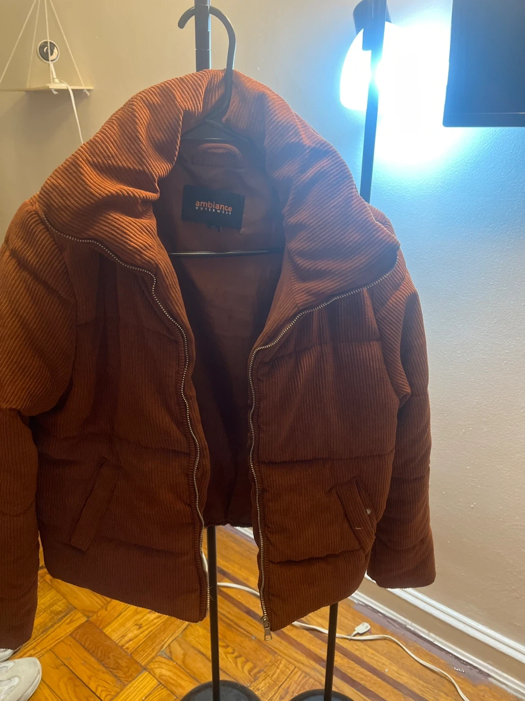 Brown corduroy puffer jacket from Ambiance. It's a stylish outerwear piece perfect for cooler weather. Features a full zip closure and two front pockets.