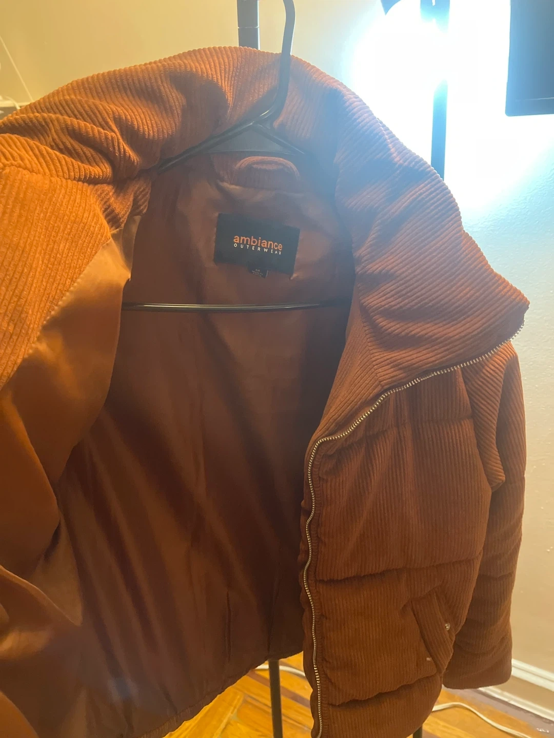 Brown corduroy puffer jacket from Ambiance. It's a stylish outerwear piece perfect for cooler weather. Features a full zip closure and two front pockets.