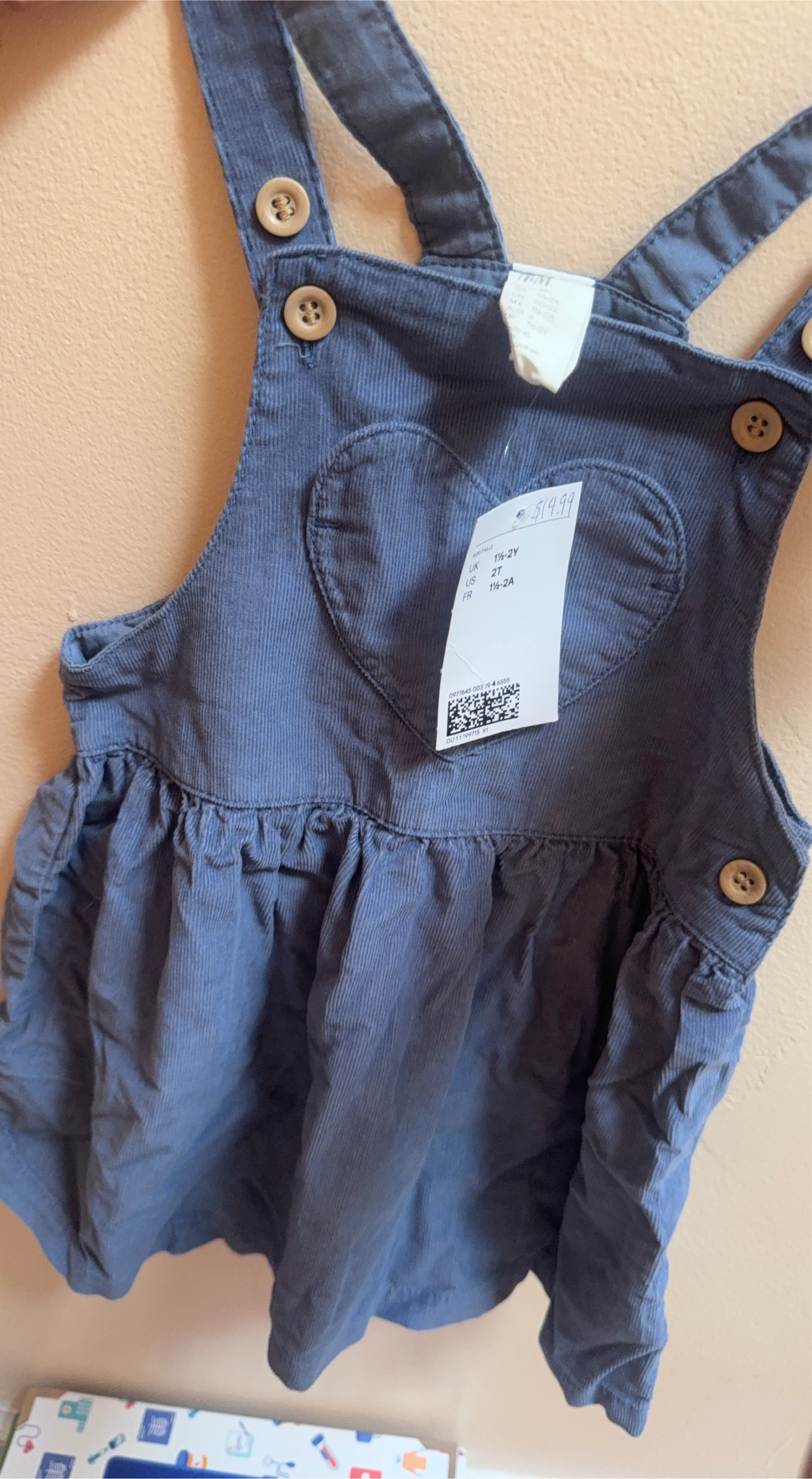 This adorable blue corduroy jumper dress from H&M is in great condition! The size is 2T, perfect for a toddler. It features cute button details and a heart-shaped accent. Originally bought for $14.99