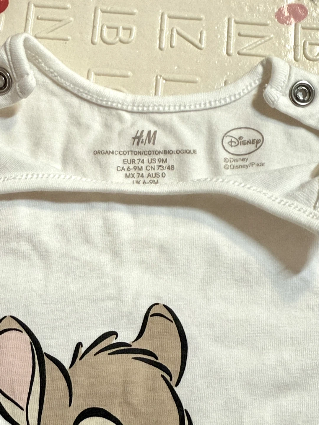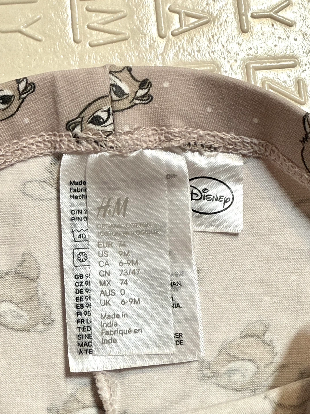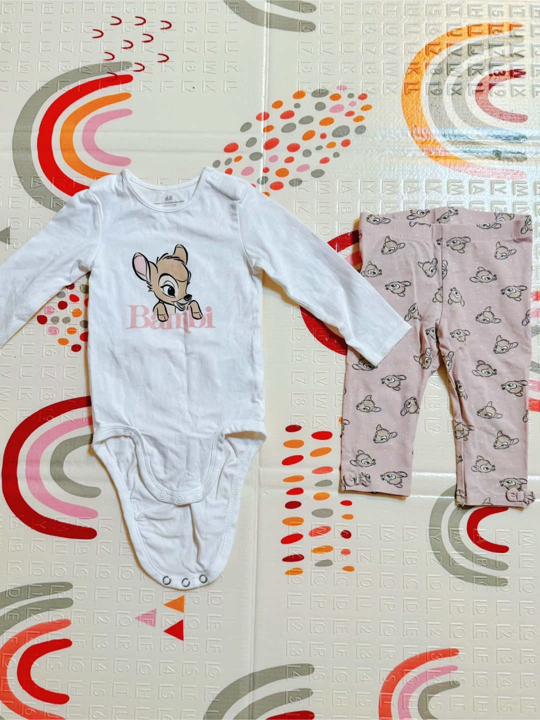 84Selling a cute H&M Disney Bambi outfit set! This set includes a long-sleeve onesie and leggings, both in size 6-9M. The onesie is white with a Bambi print, and the leggings are pink with a Bambi pattern. Only worn once!