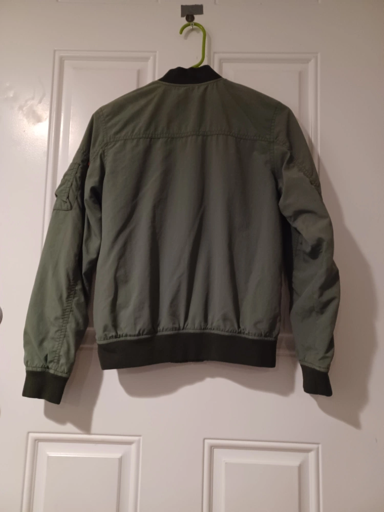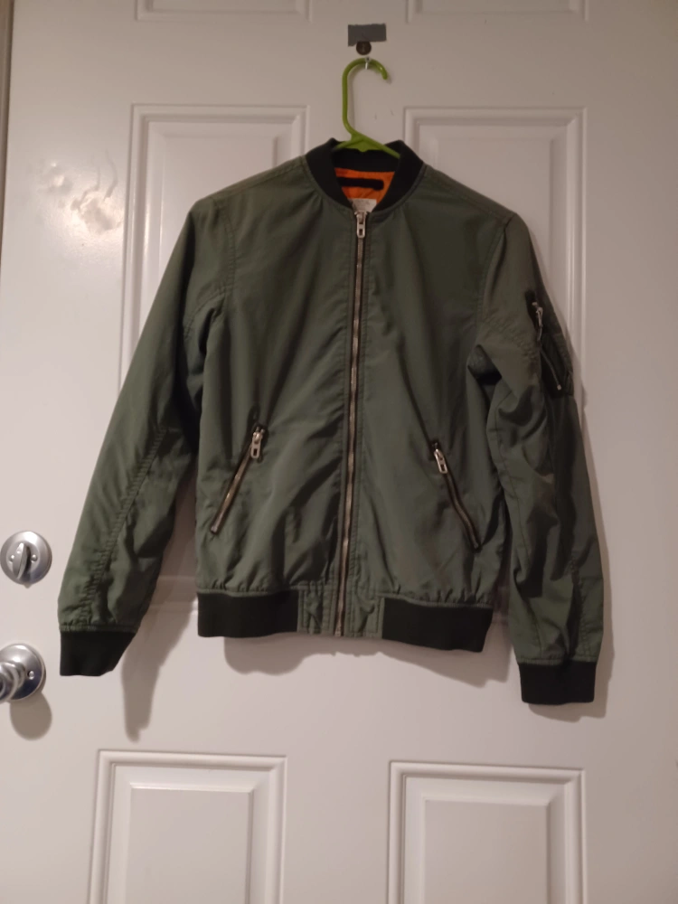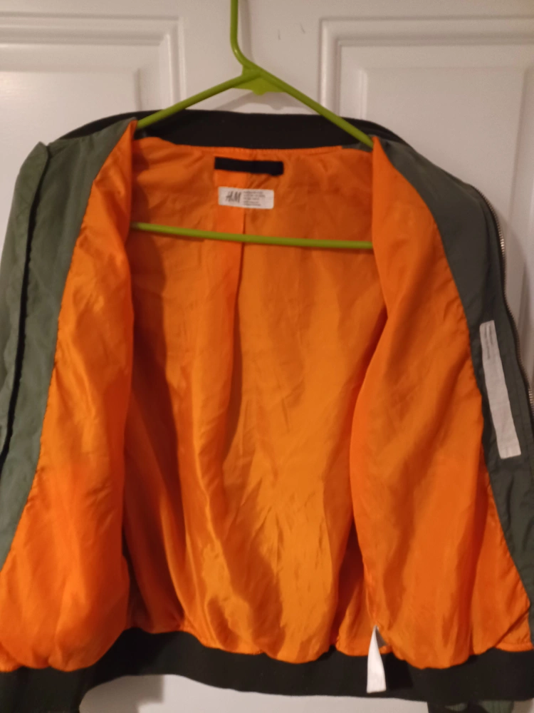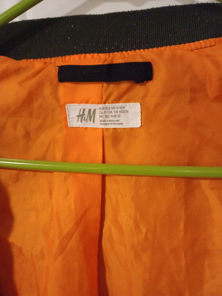 Selling a gently used H&M bomber jacket. It's an olive green color with an orange lining. The size is 9-10Y (EUR 152 US 11-12Y CA 11-12A CN 150/76 MX 11-12 AUS 12).