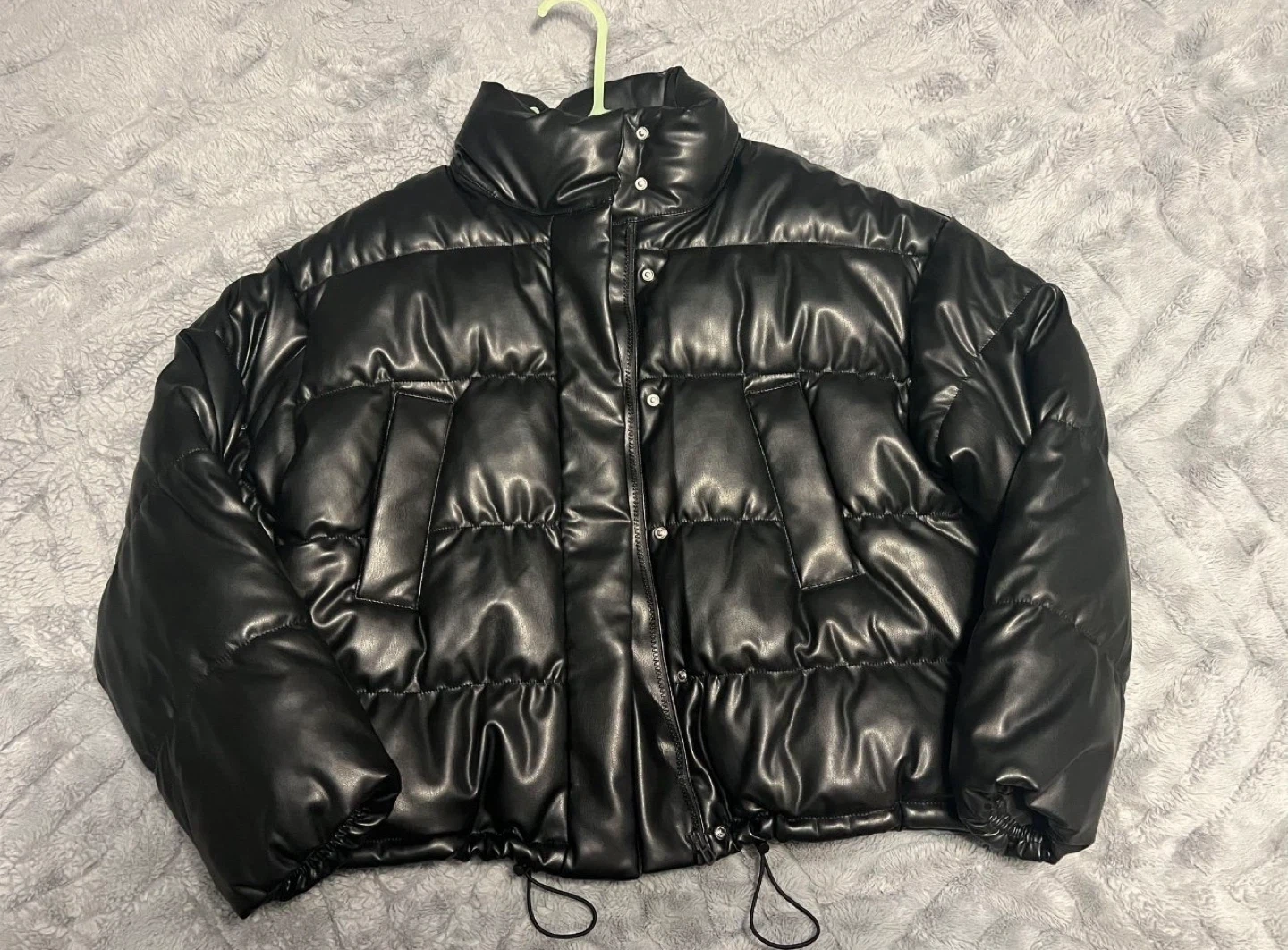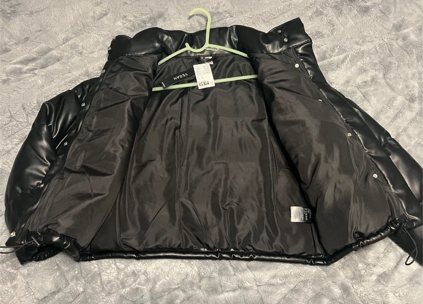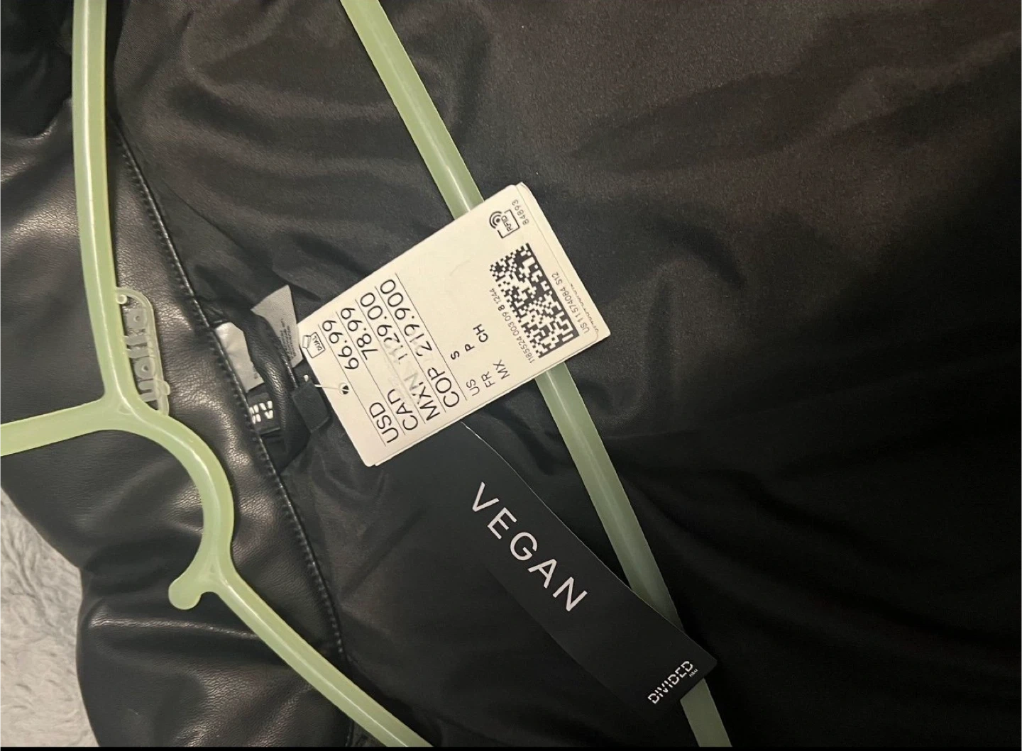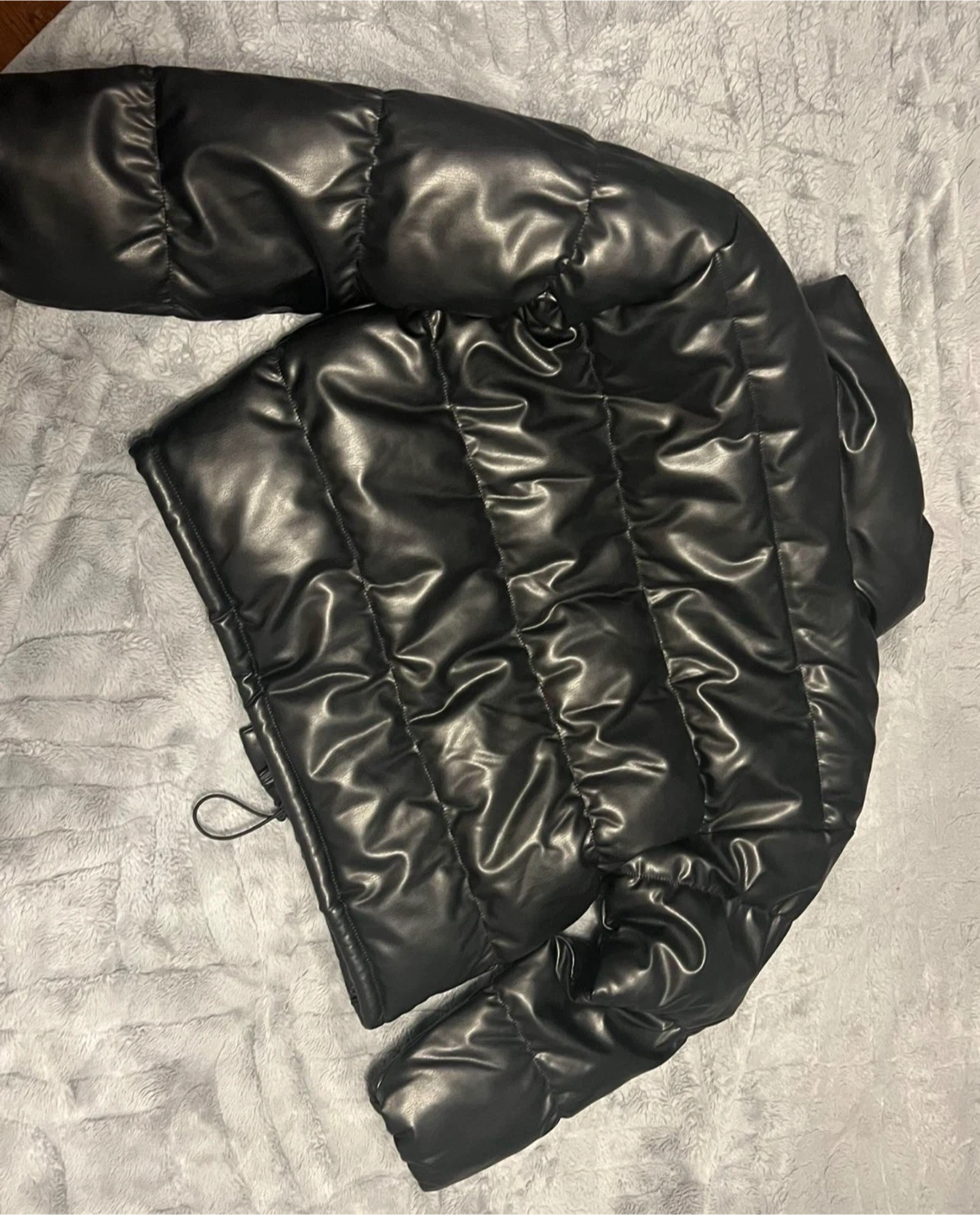 60Selling a stylish H&M Divided vegan leather puffer jacket in size S. It's a sleek black color and in great condition.