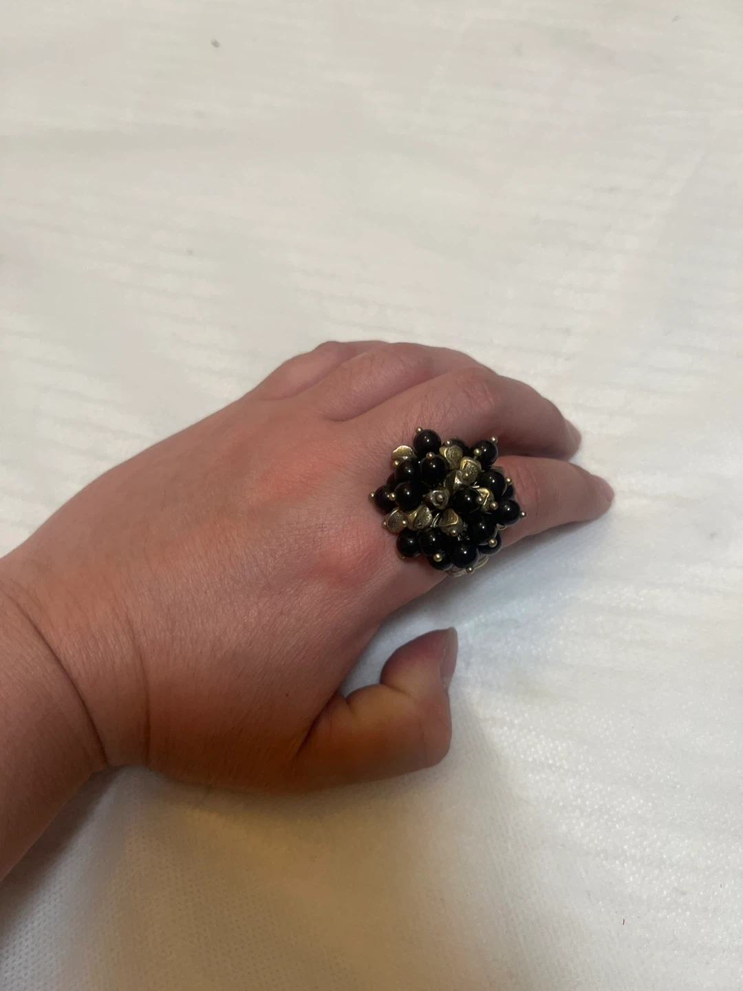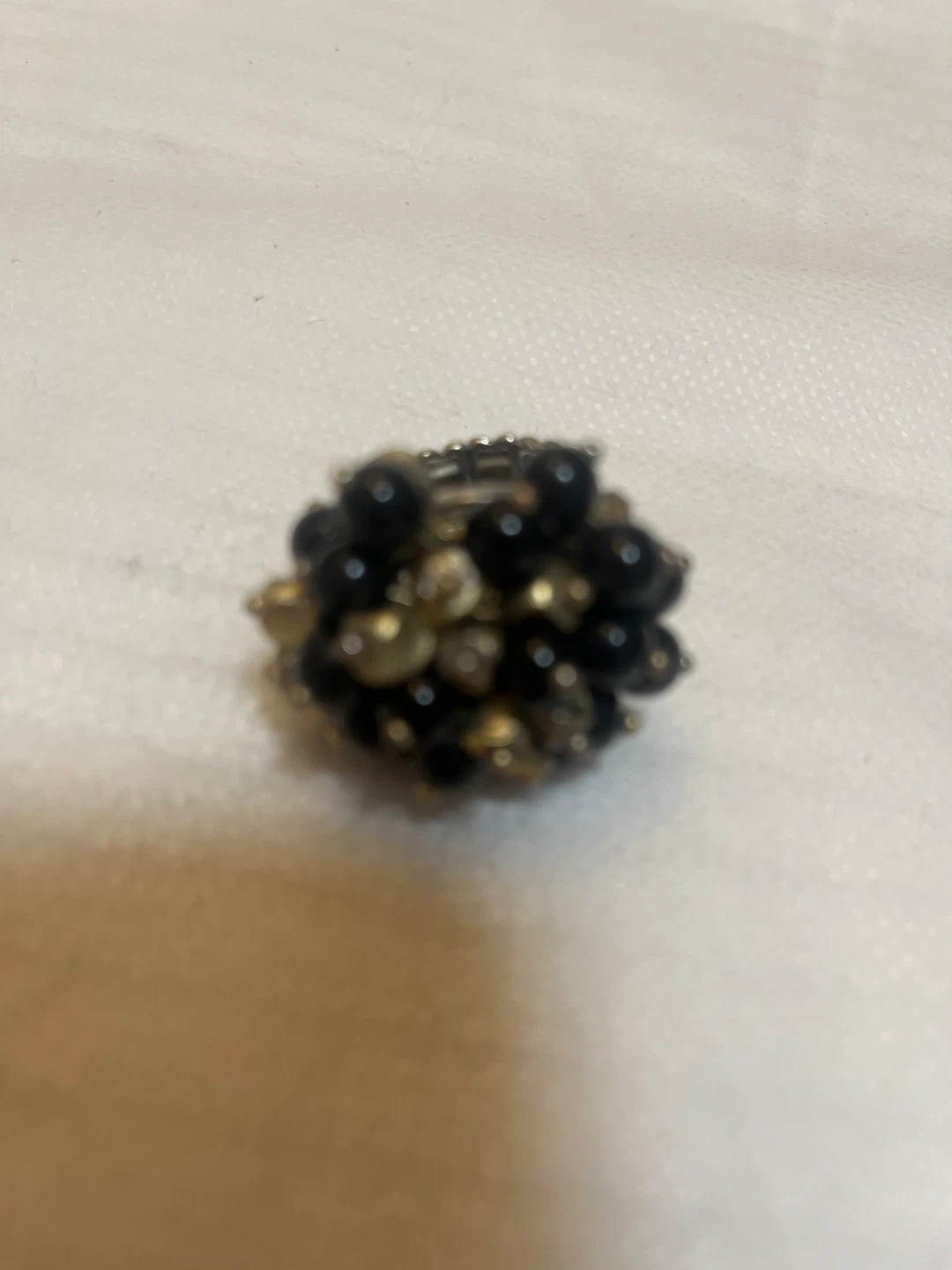 This statement ring features a cluster of black and gold beads. It's designed to be a bold accessory for any outfit. The ring has an elastic band for a comfortable fit.