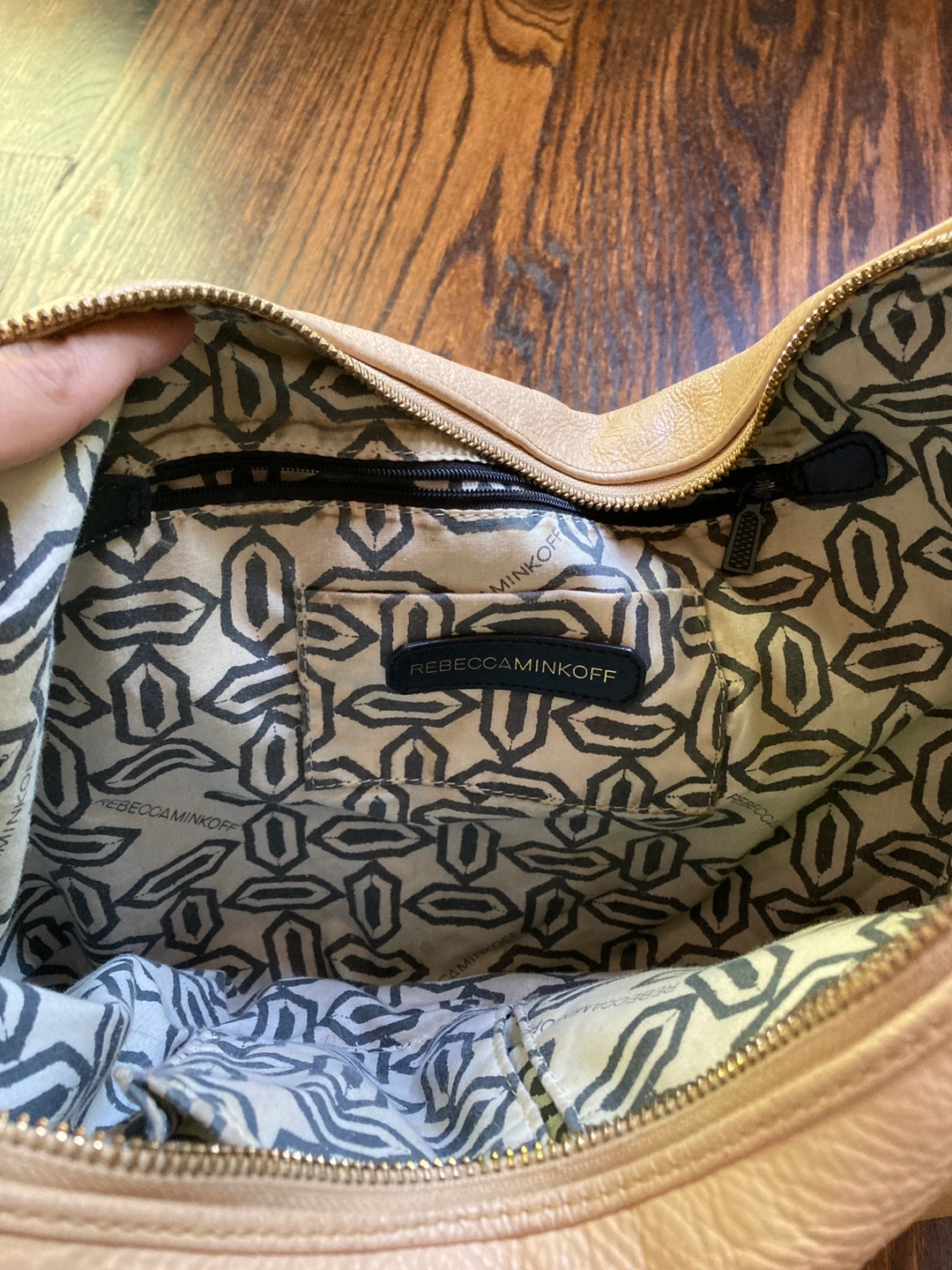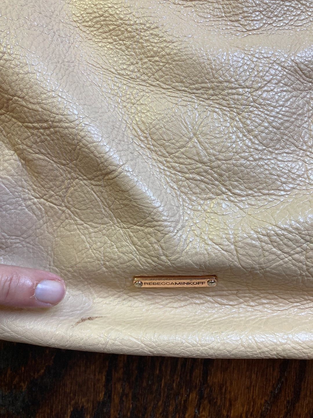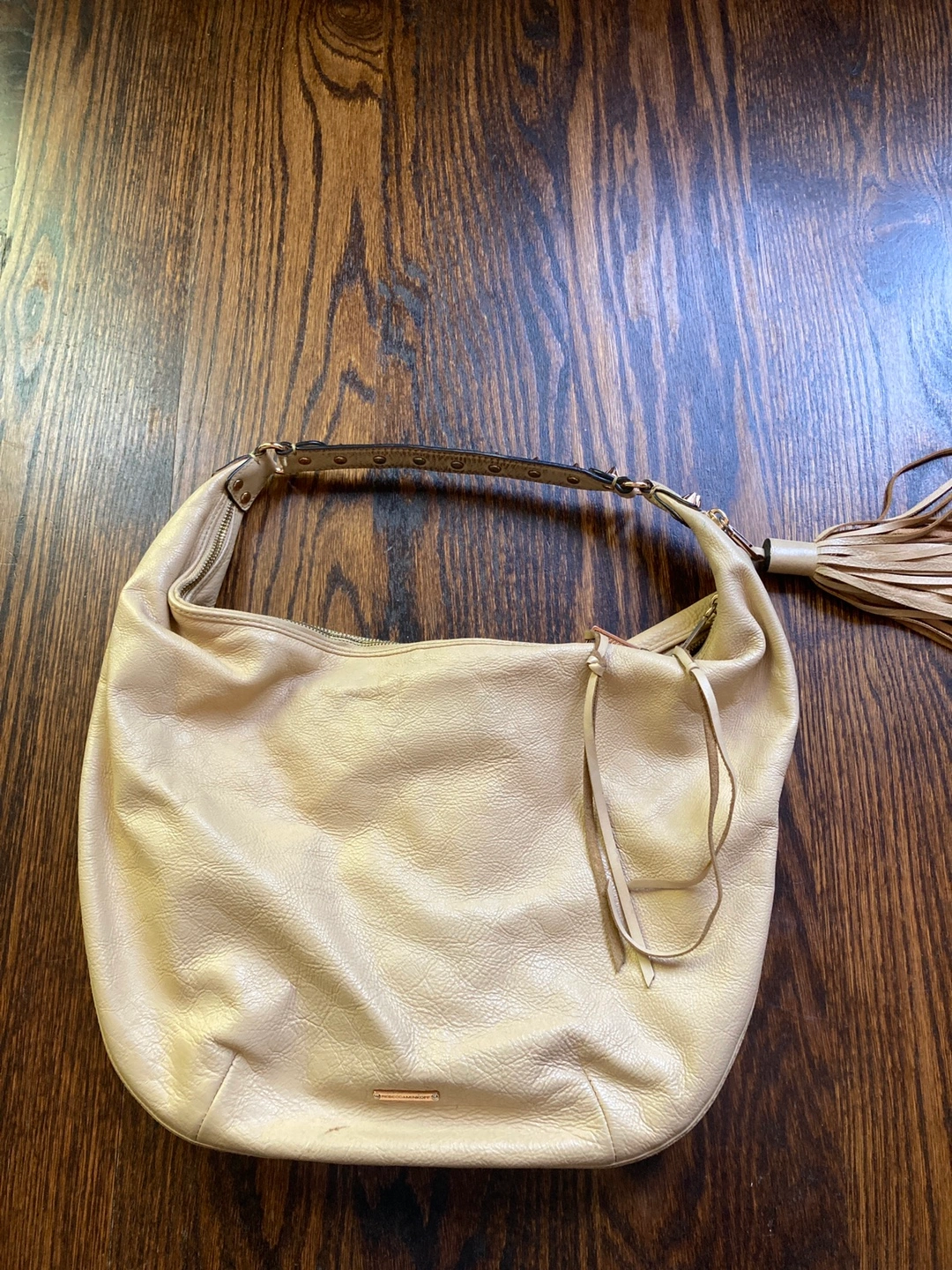 Tan coloured, real leather purse. Still in good shape. Studded purse strap, cute tassels on zippers. Interior could use a cleaning. Outside looks great except for one area, as shown in photos. Great for casual use.