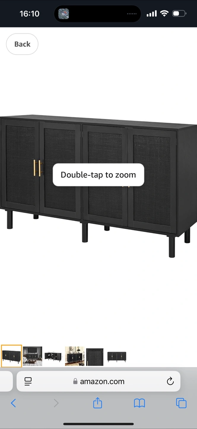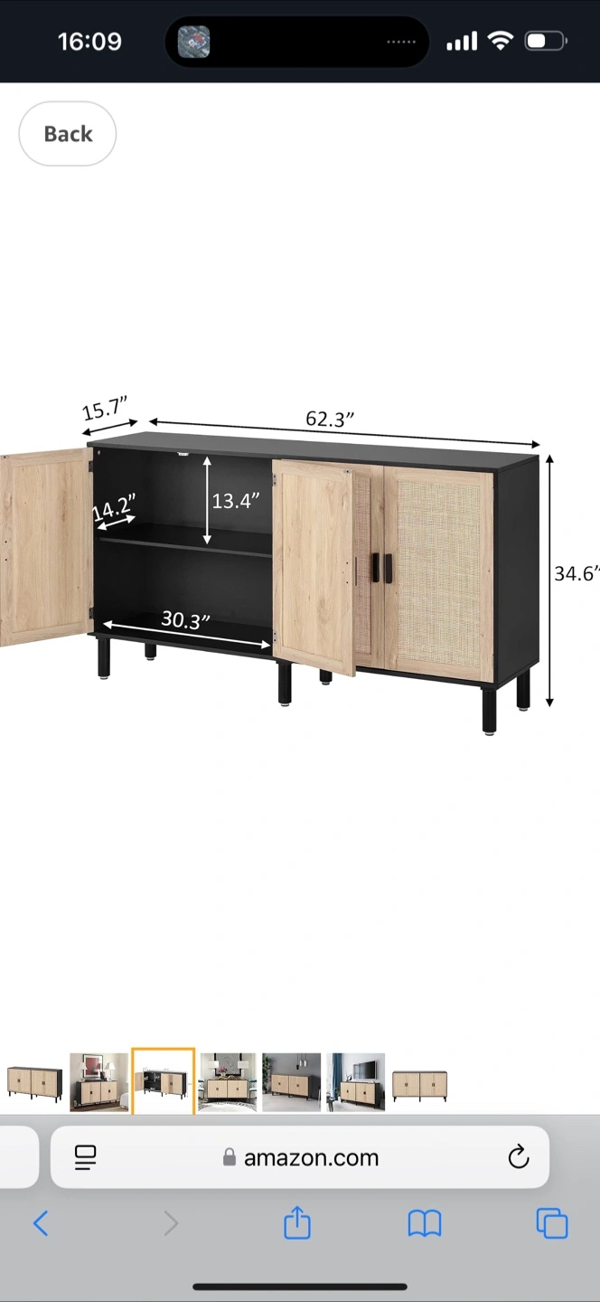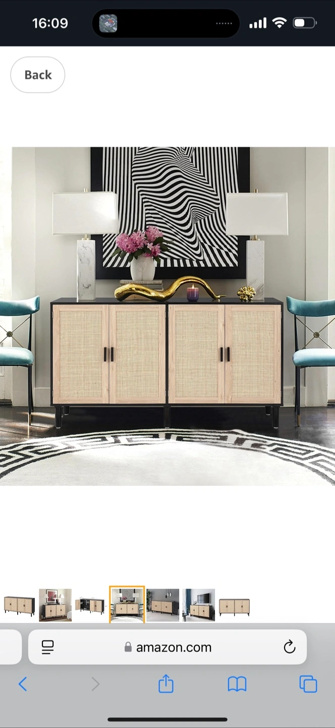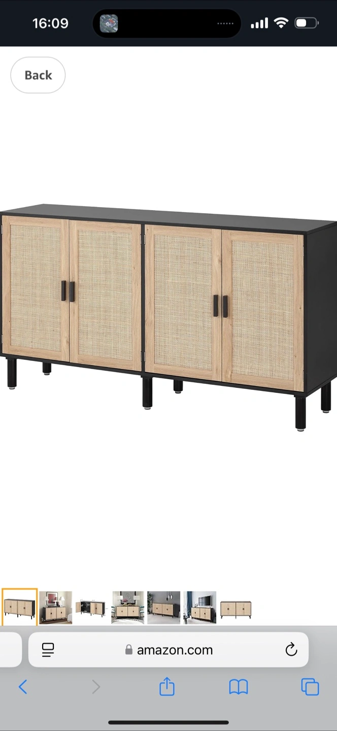 Black and light wood cabinet. Four doors with woven detailing. Sleek legs. Ample storage space. Perfect for entryway or living room.