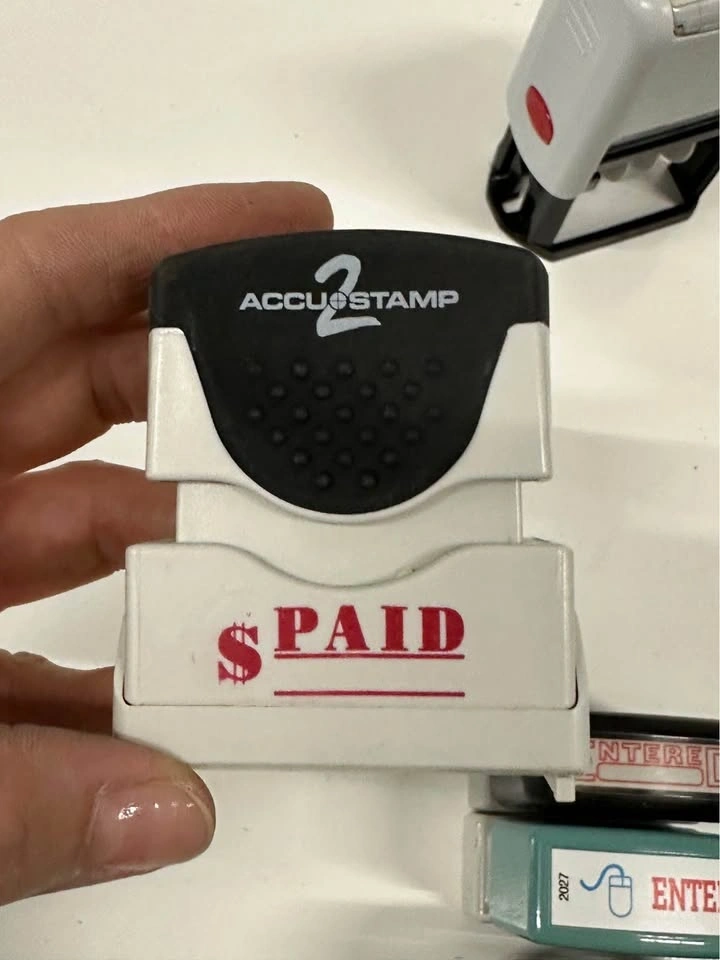 Set of office stamps in good condition. Includes: PAID (with date), VOID, COPY, PAST DUE, ENTERED. Different brands (AccuStamp, Offistamp, etc.). Great for office or business use. Pickup in Buffalo Grove.