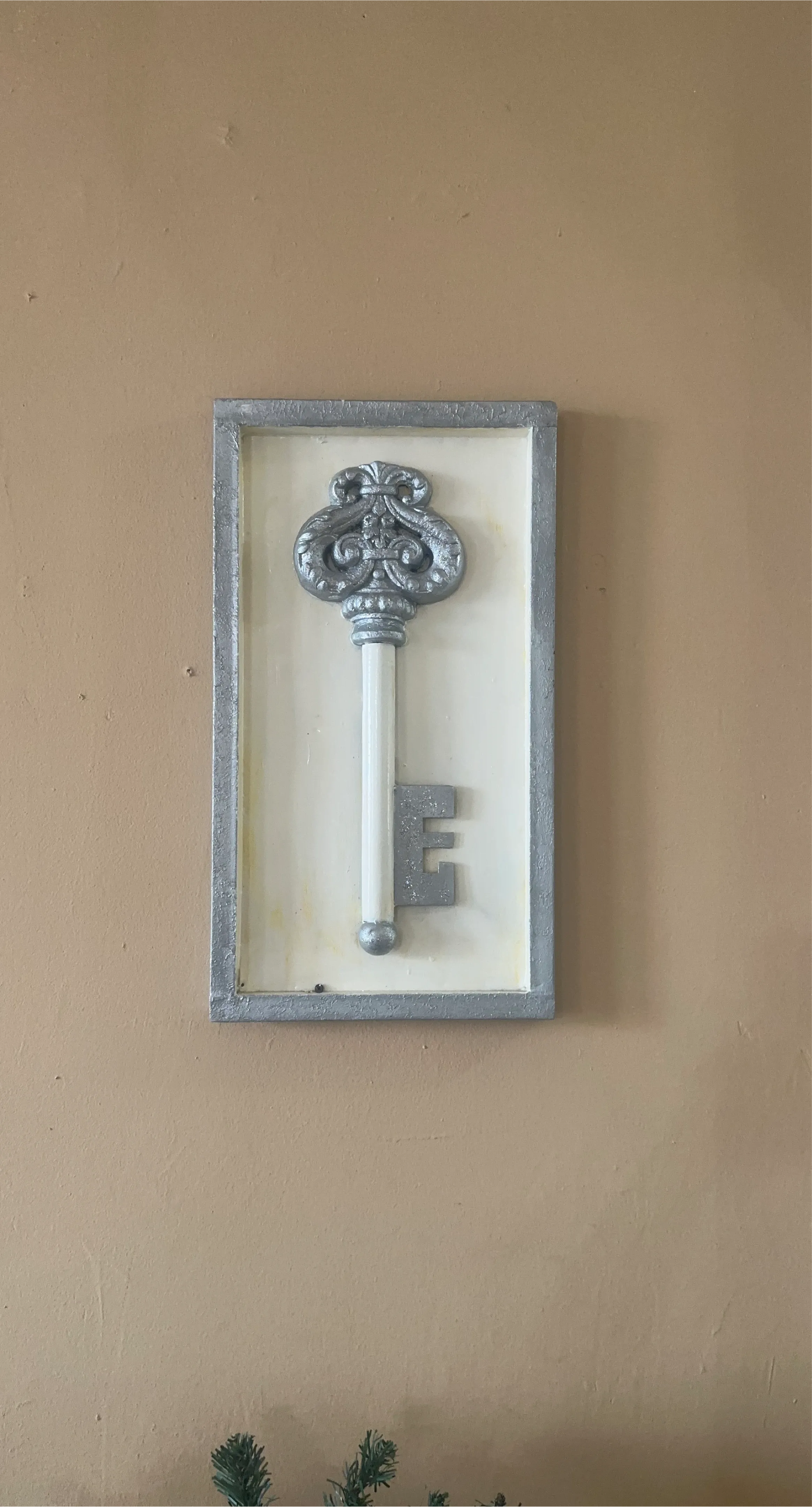 This decorative piece features a vintage-style key mounted on a cream-colored backing with a silver-painted distressed frame. It's a unique accent for any room!