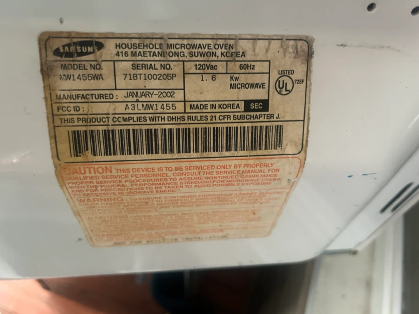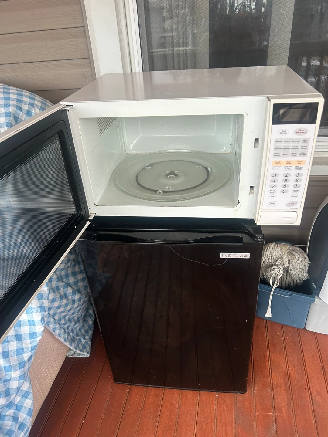 White Samsung microwave oven with digital display and keypad. Manufactured January 2002. Black Insignia mini-fridge with glass shelves. Compact combo perfect for small spaces!
