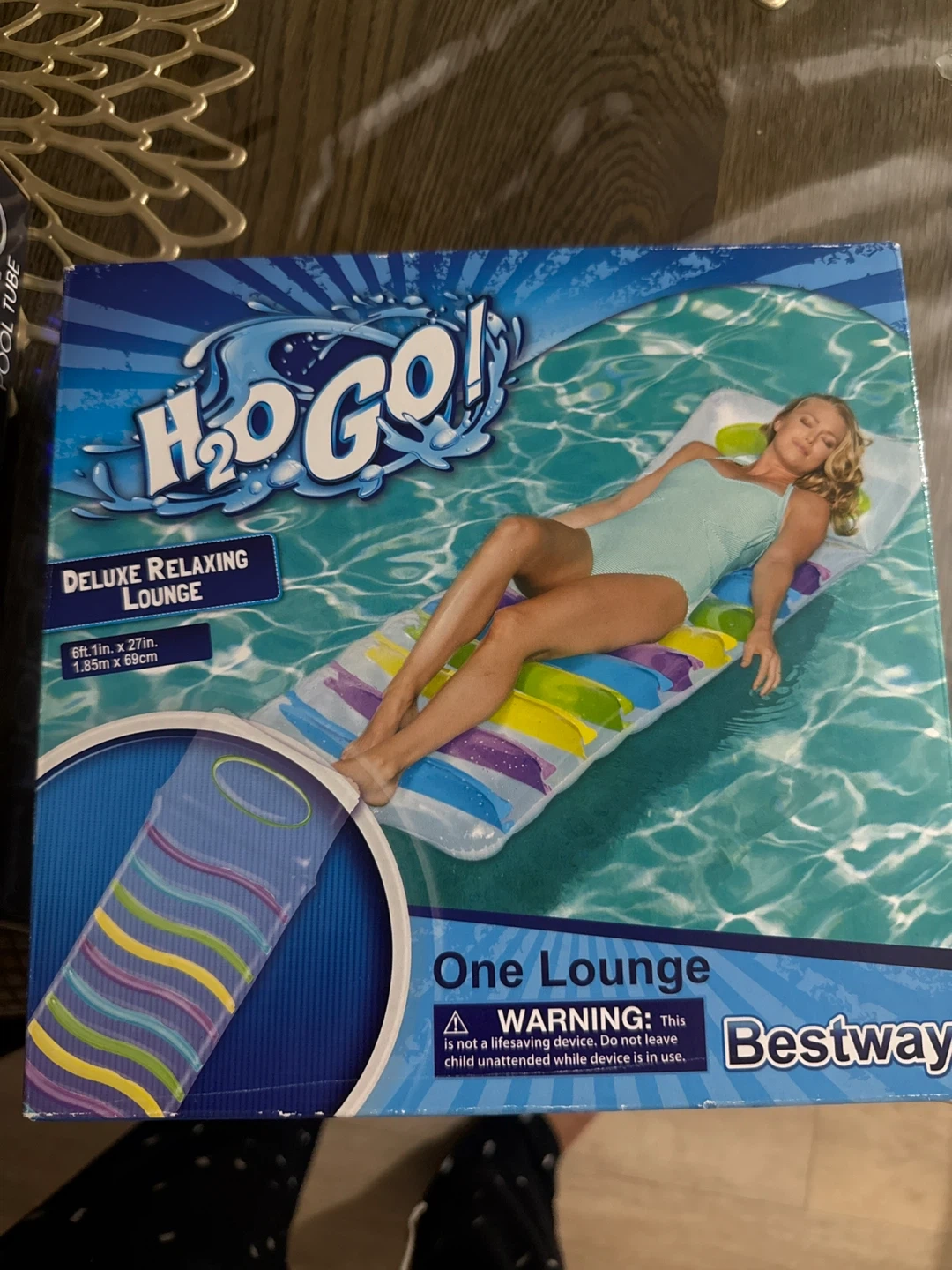 12Selling a H2OGO! Deluxe Relaxing Lounge and a PoolCandy holographic beach & pool tube. The lounge is 6ft 1in x 27in, or 1.85m x 69cm. The pool tube is 42 inches, or 106 cm. Both are brand new in the box!
