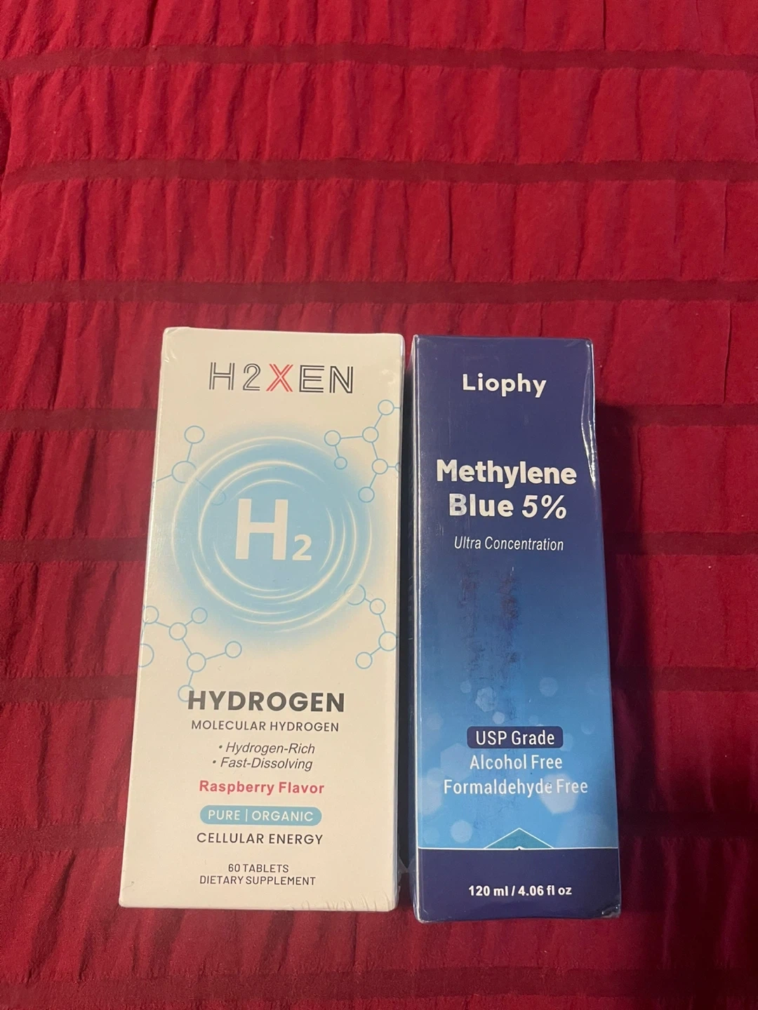 67Selling a set of H2XEN Hydrogen Molecular Hydrogen tablets with Raspberry Flavor and Liophy Methylene Blue 5% Ultra Concentration. Both are dietary supplements. H2XEN contains 60 tablets and is pure and organic cellular energy. Liophy is USP Grade, alcohol-free, and formaldehyde-free in a 120 ml / 4.06 fl oz bottle 2x1