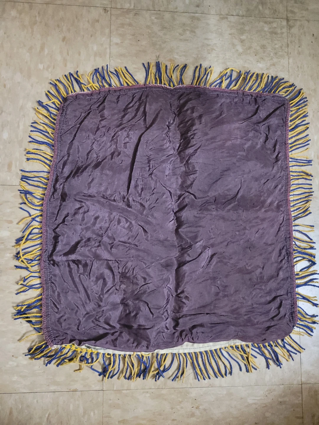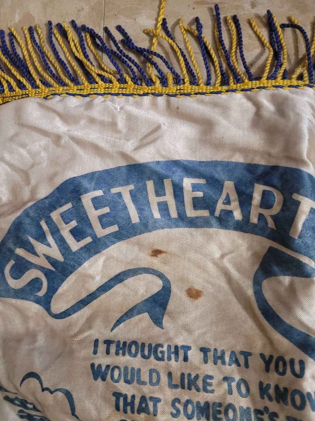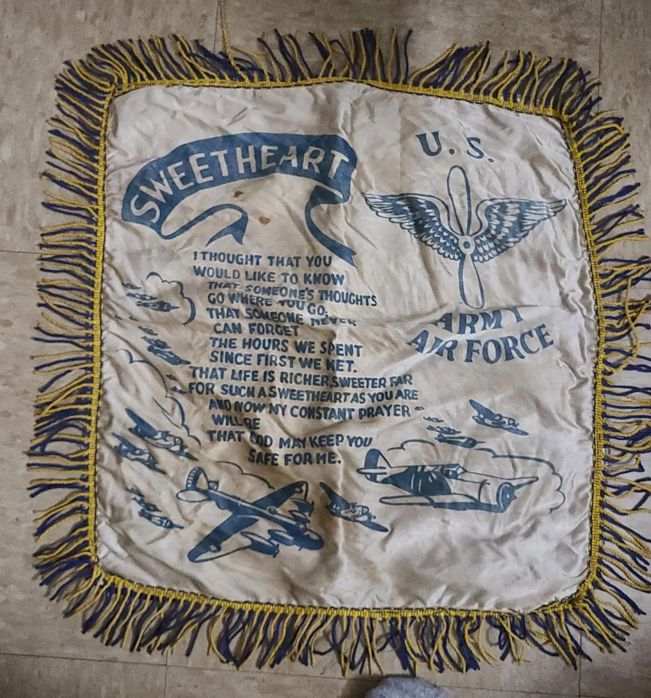 Vintage U.S. Army Air Force "Sweetheart" pillow cover with printed poem and aircraft graphics. Features a satin-like fabric with a yellow and blue fringe. Likely from WWII era. 17" x 17" without fringe.