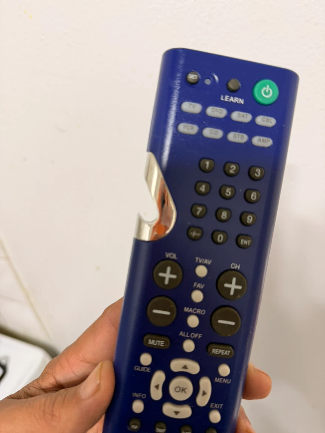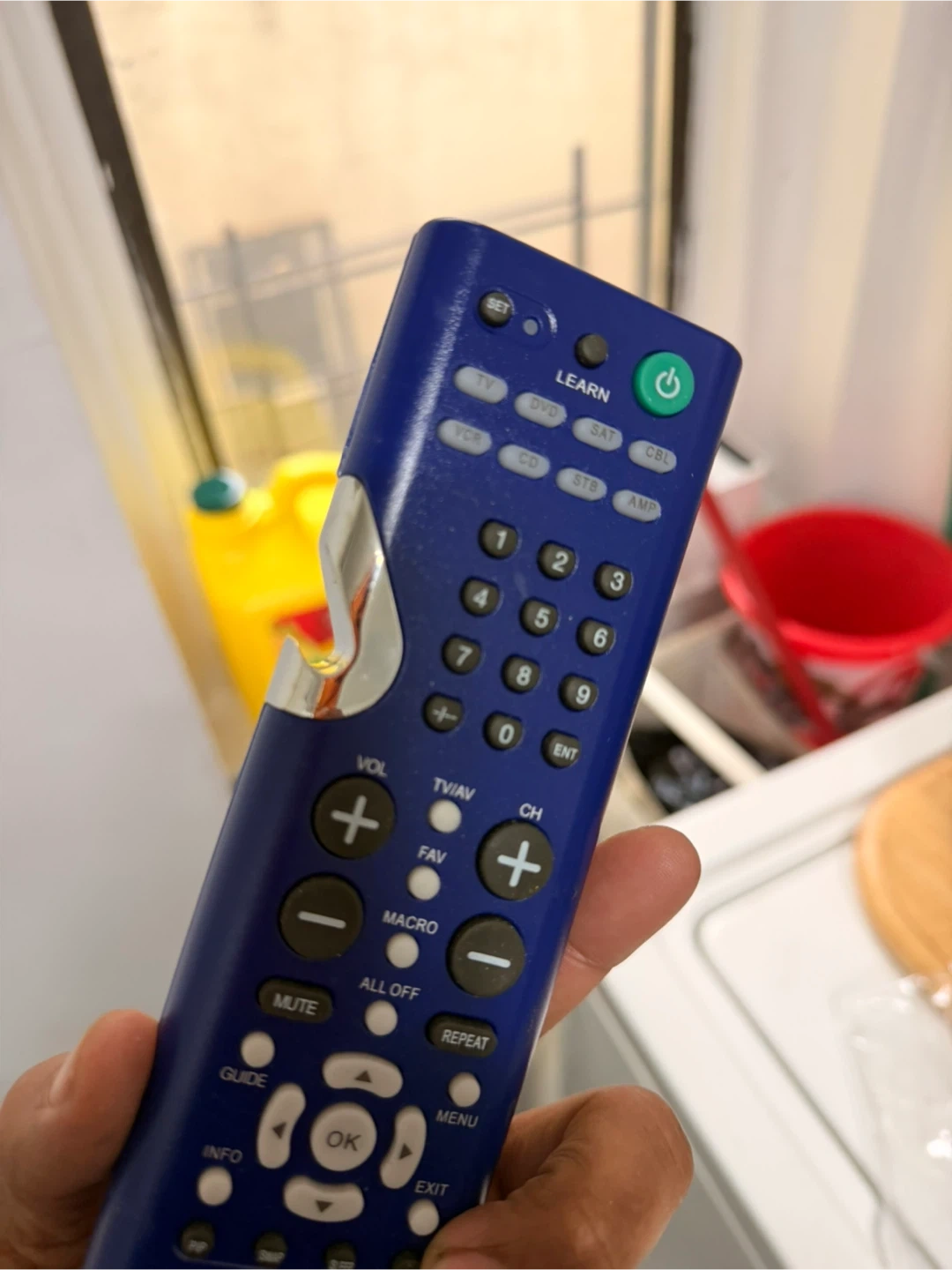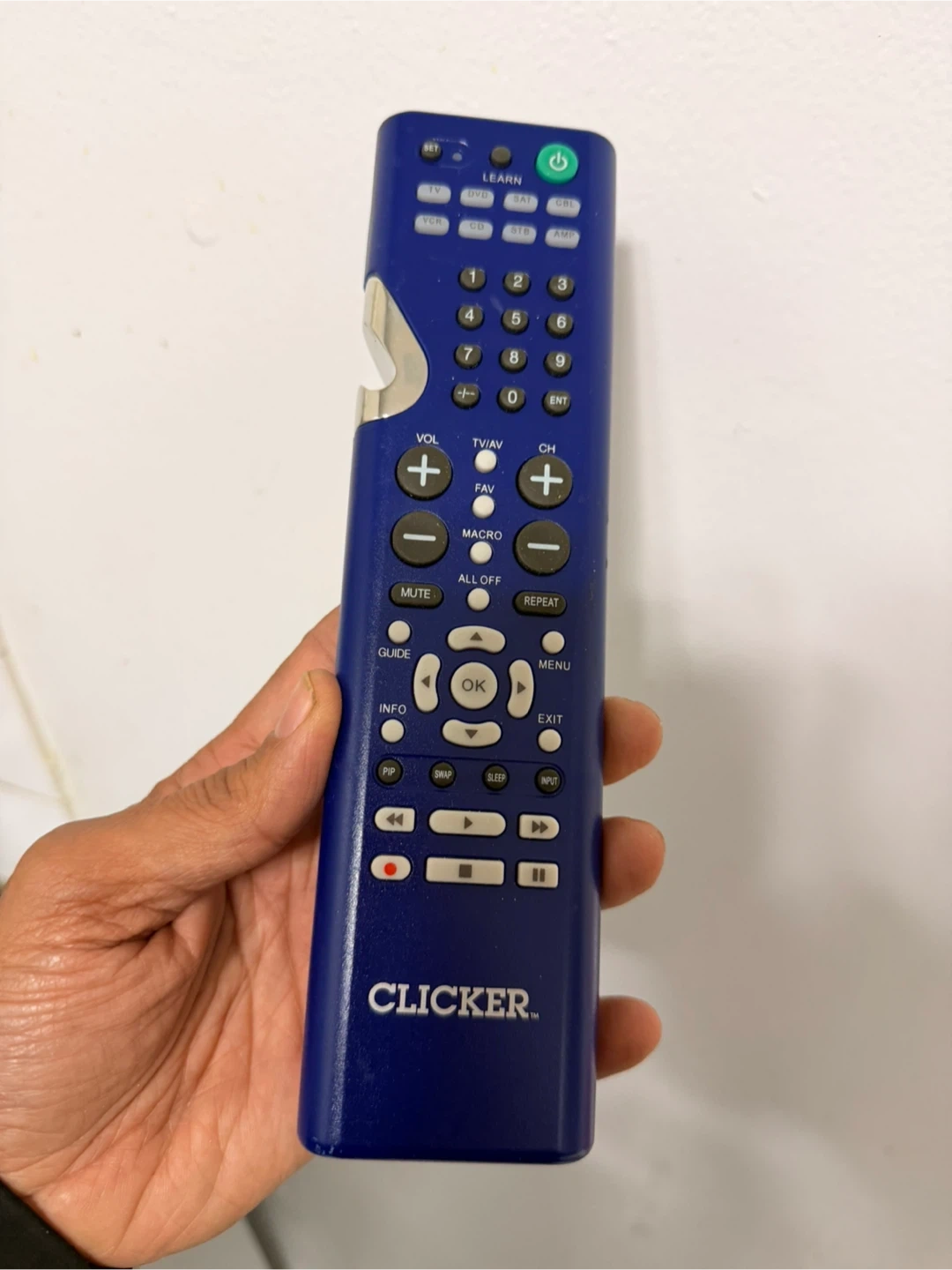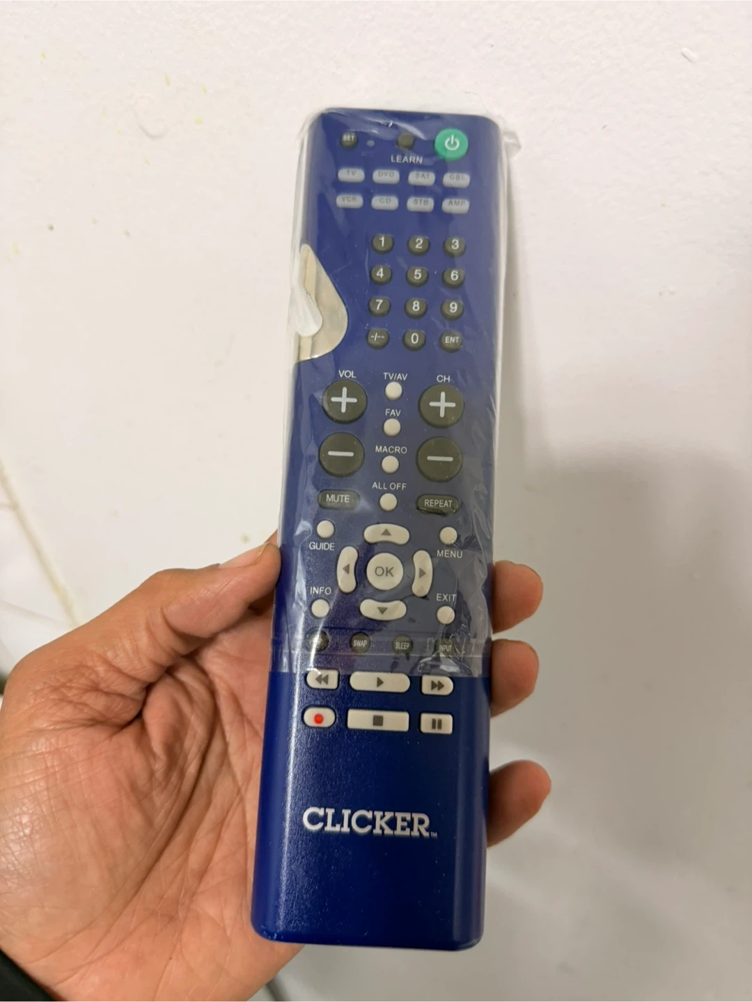 This is a blue Clicker open bottles and universal remote control. It has buttons for TV, DVD, VCR, CD, SAT, CBL, AMP, and more. Functions include volume, channel, mute, guide, and menu controls. It's a programmable remote for your home entertainment system.