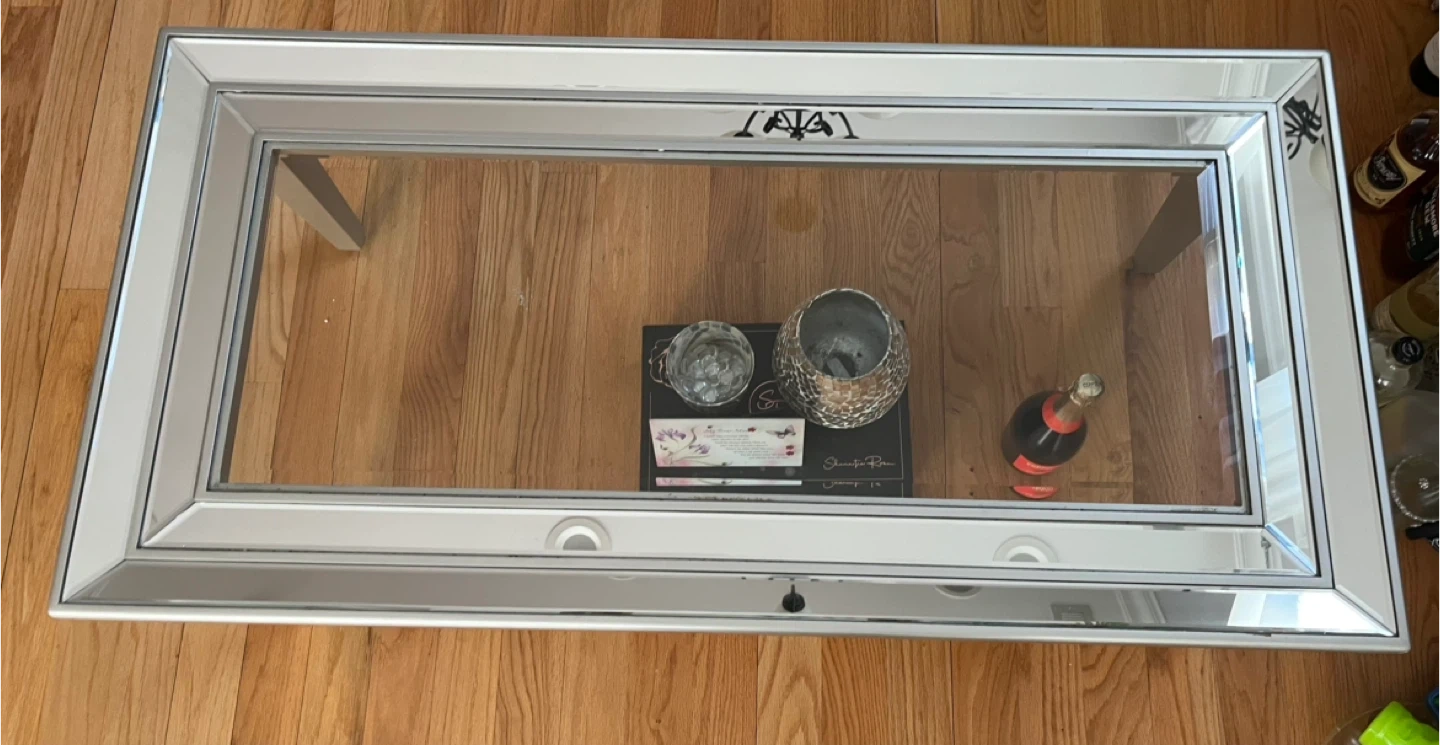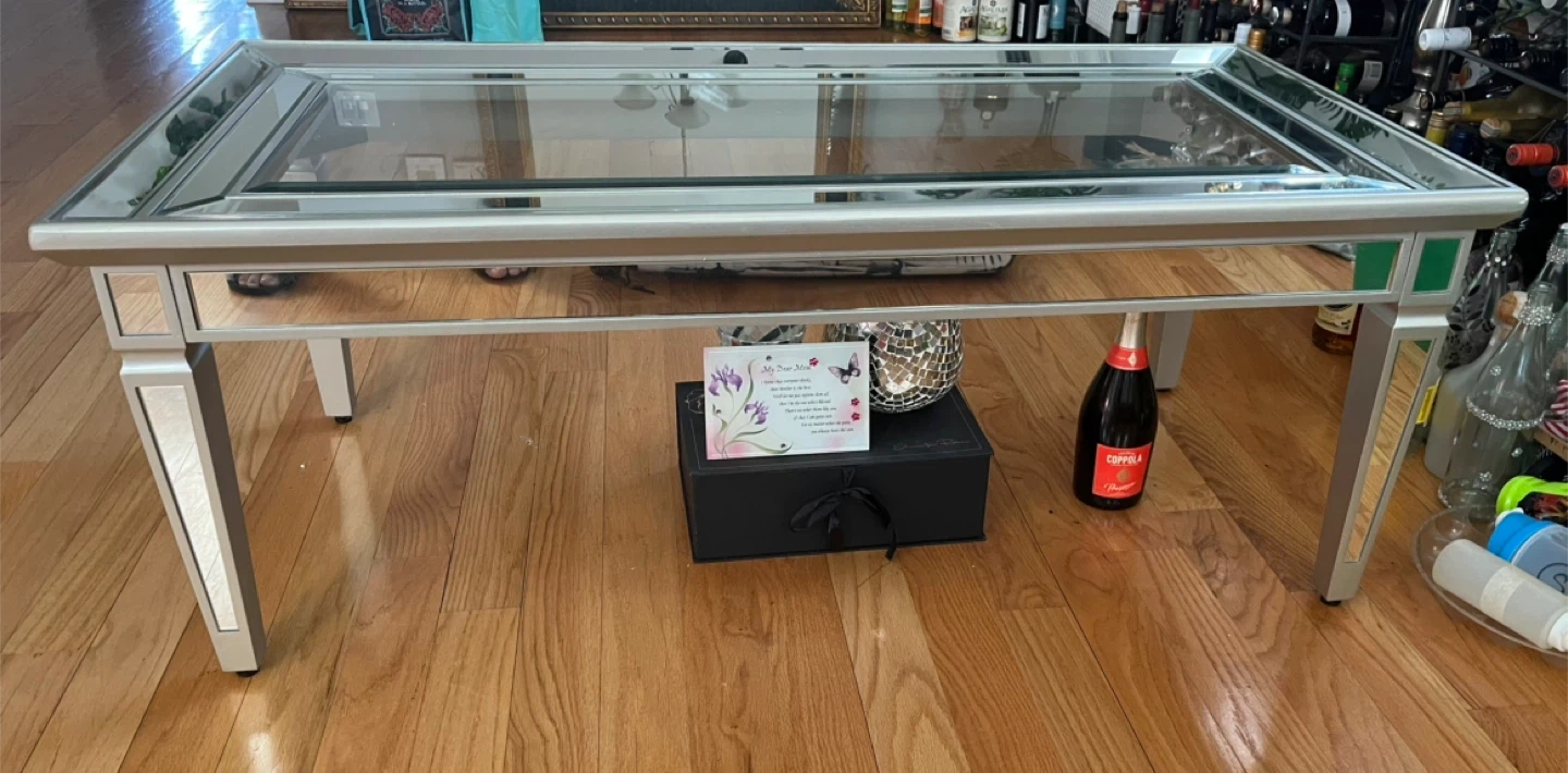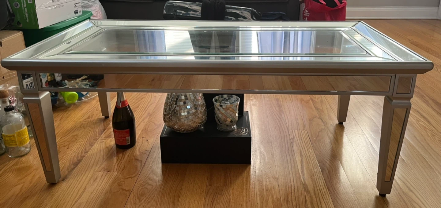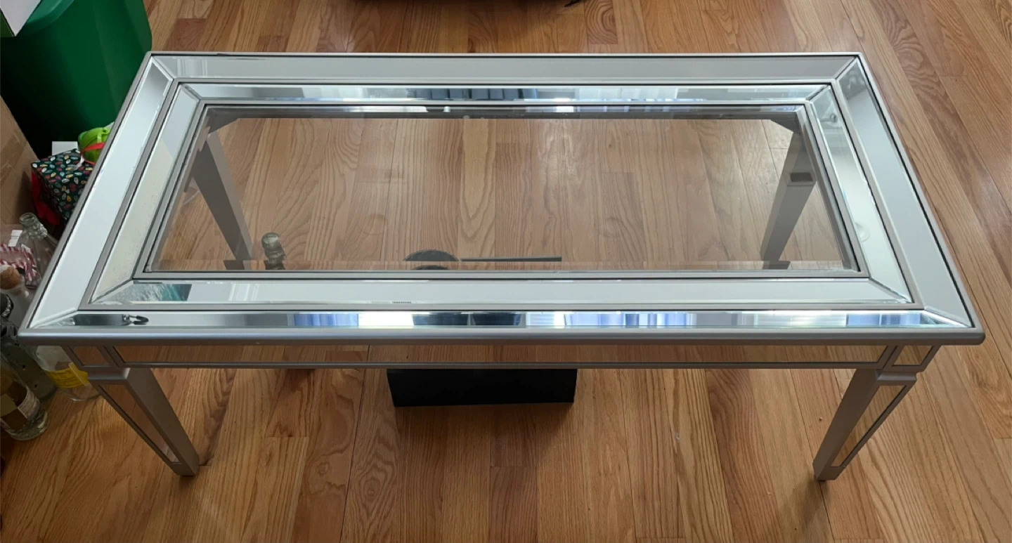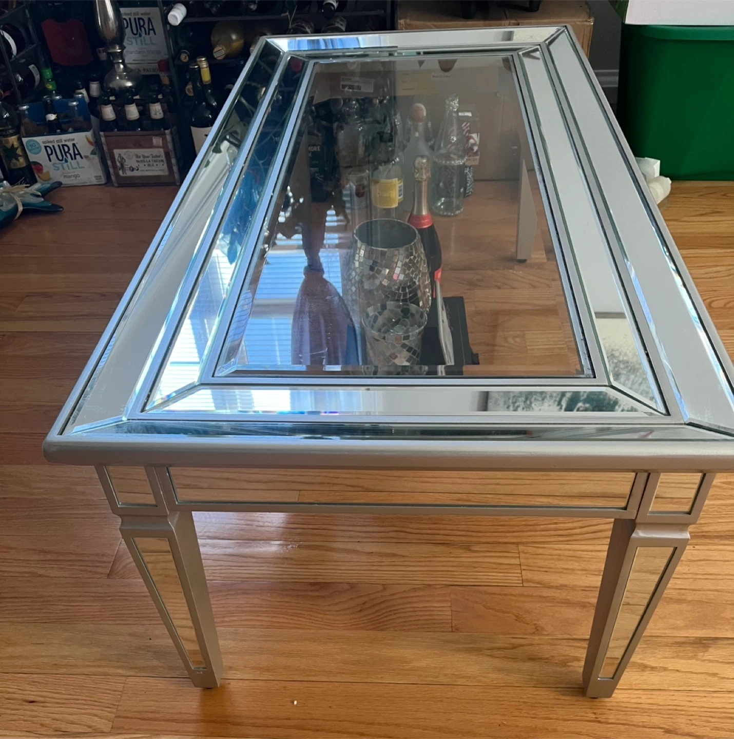This coffee table features a mirrored frame and a clear glass top. It's a stylish addition to any living space. The mirrored accents reflect light beautifully!