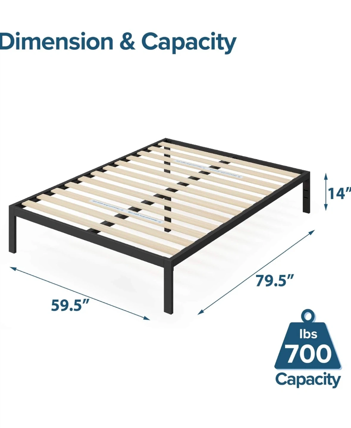 Queen sized metal platform bed frame with wood slat support. Lots of room for storage underneath. 79.5" L x 59.3" W x 14" H. Originally purchased for $115.