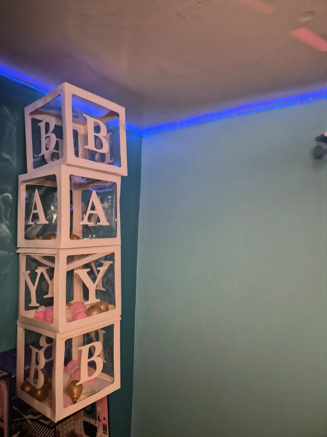 This set includes four white decorative blocks spelling out "BABY." Each block is open on one side and comes with pink and gold balloons. They're perfect for a baby shower or gender reveal party!