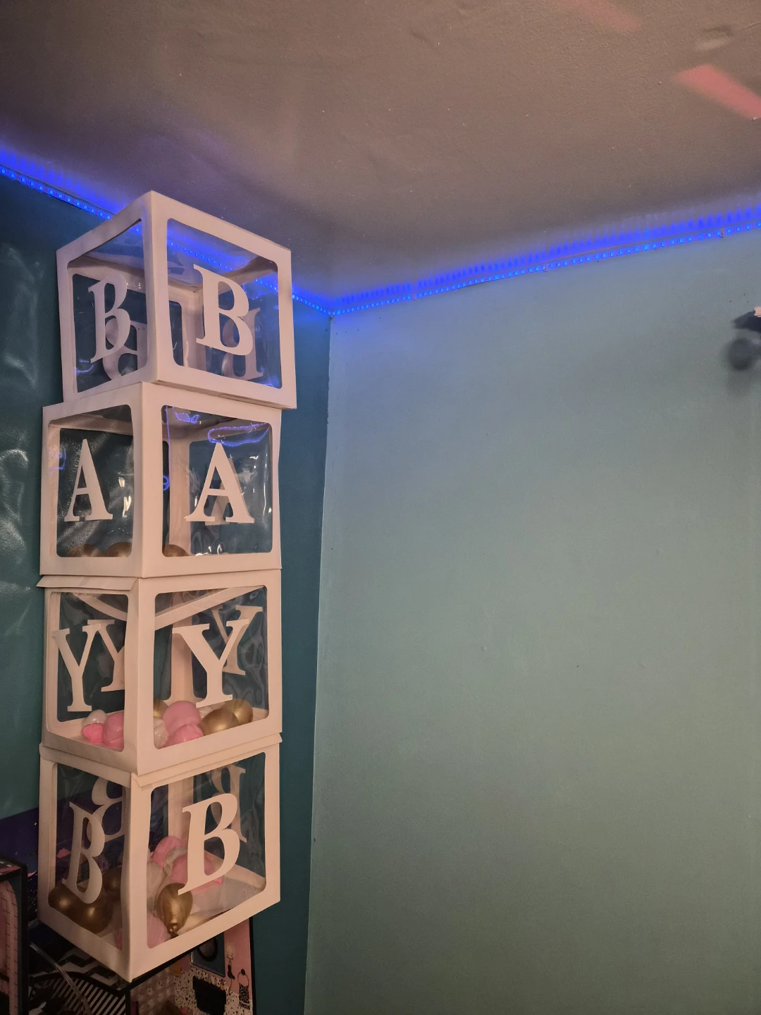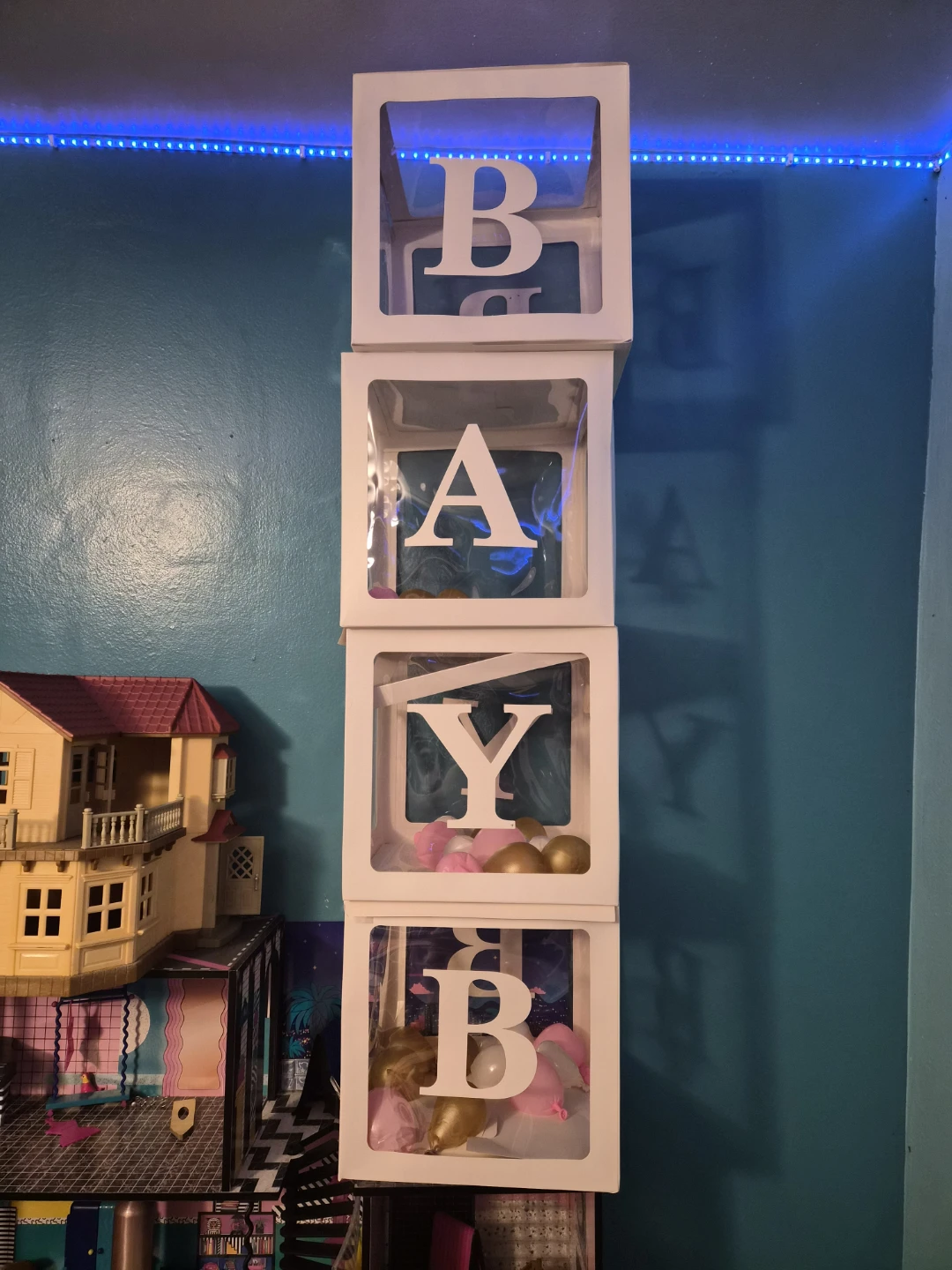This set includes four white decorative blocks spelling out "BABY." Each block is open on one side and comes with pink and gold balloons. They're perfect for a baby shower or gender reveal party!