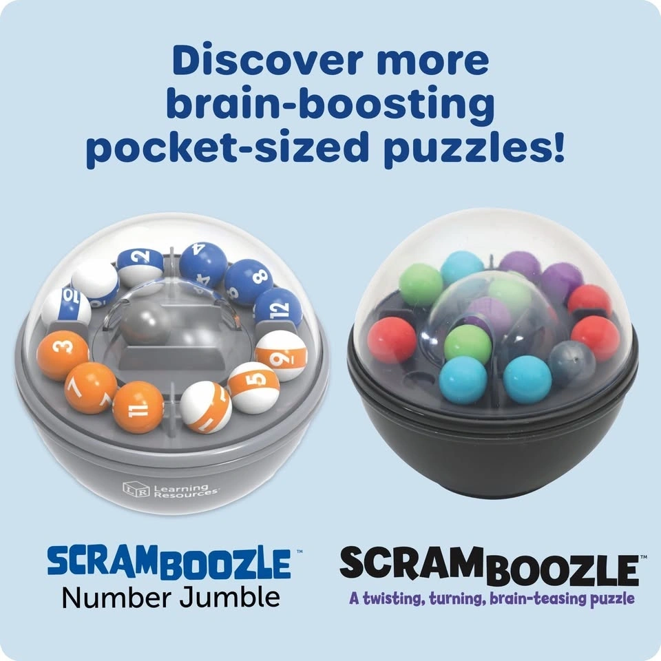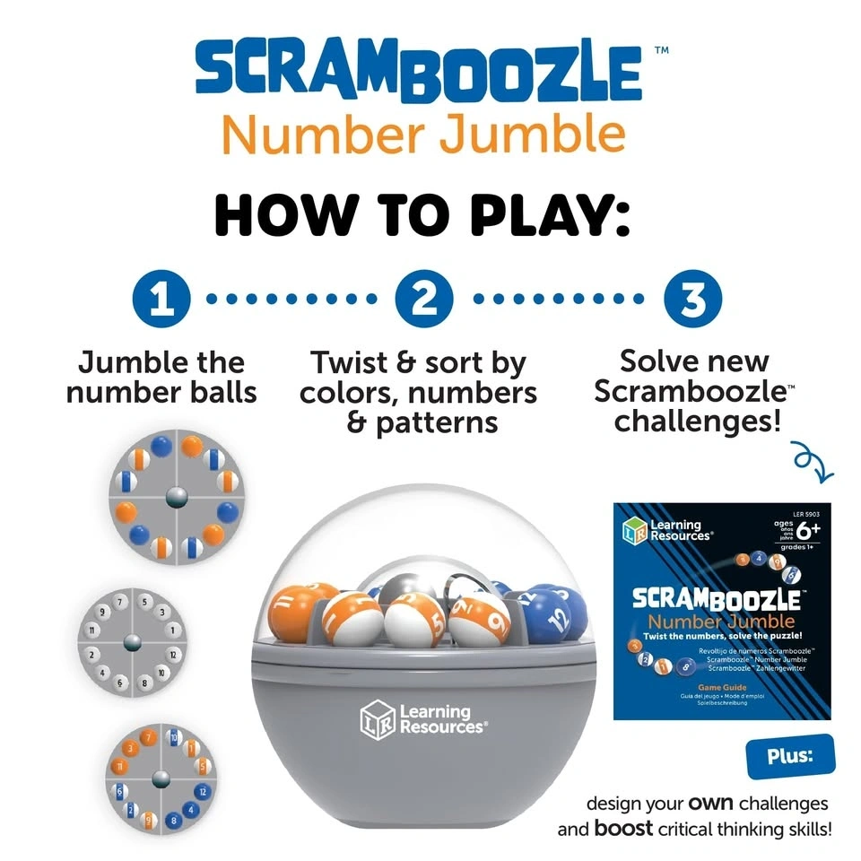 Challenging Learning Resources Scramboozle Number Jumble game! This puzzle has you scramble, shift, and solve numbers. Great for ages 6 to adult, with over 40 next-level challenges. Super portable, good for on-the-go fun and it's screen-free!