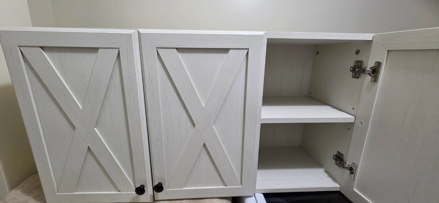 Brand new in box never opened. This wall cabinet features a distressed white finish and X-design doors. It has two shelves inside for storage. Measures approximately 35 1/2 inches wide by 18 1/2 inches tall.