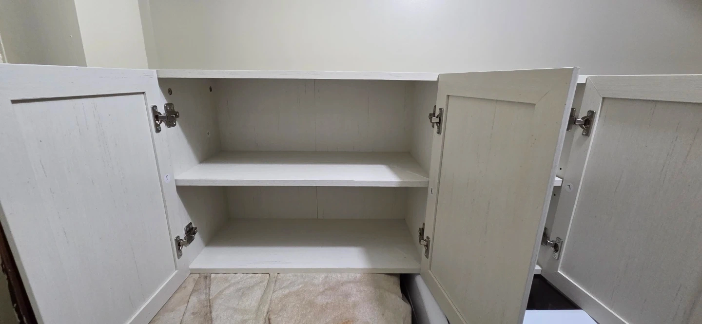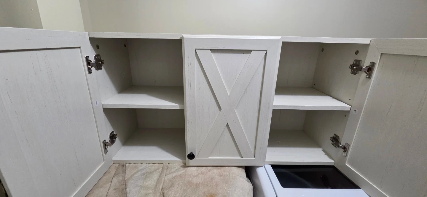 Brand new in box never opened. This wall cabinet features a distressed white finish and X-design doors. It has two shelves inside for storage. Measures approximately 35 1/2 inches wide by 18 1/2 inches tall.