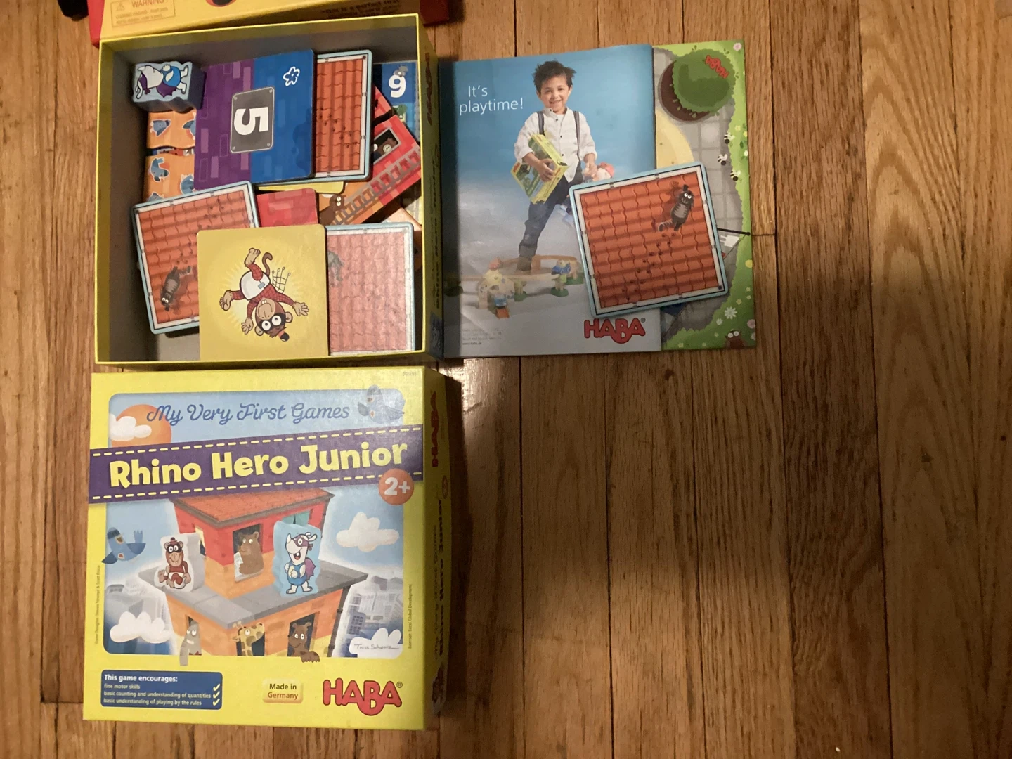 This is the HABA Rhino Hero Junior board game. It's part of the 'My Very First Games' series. The game is recommended for ages 2 and up! It encourages fine motor skills and basic understanding of rules.