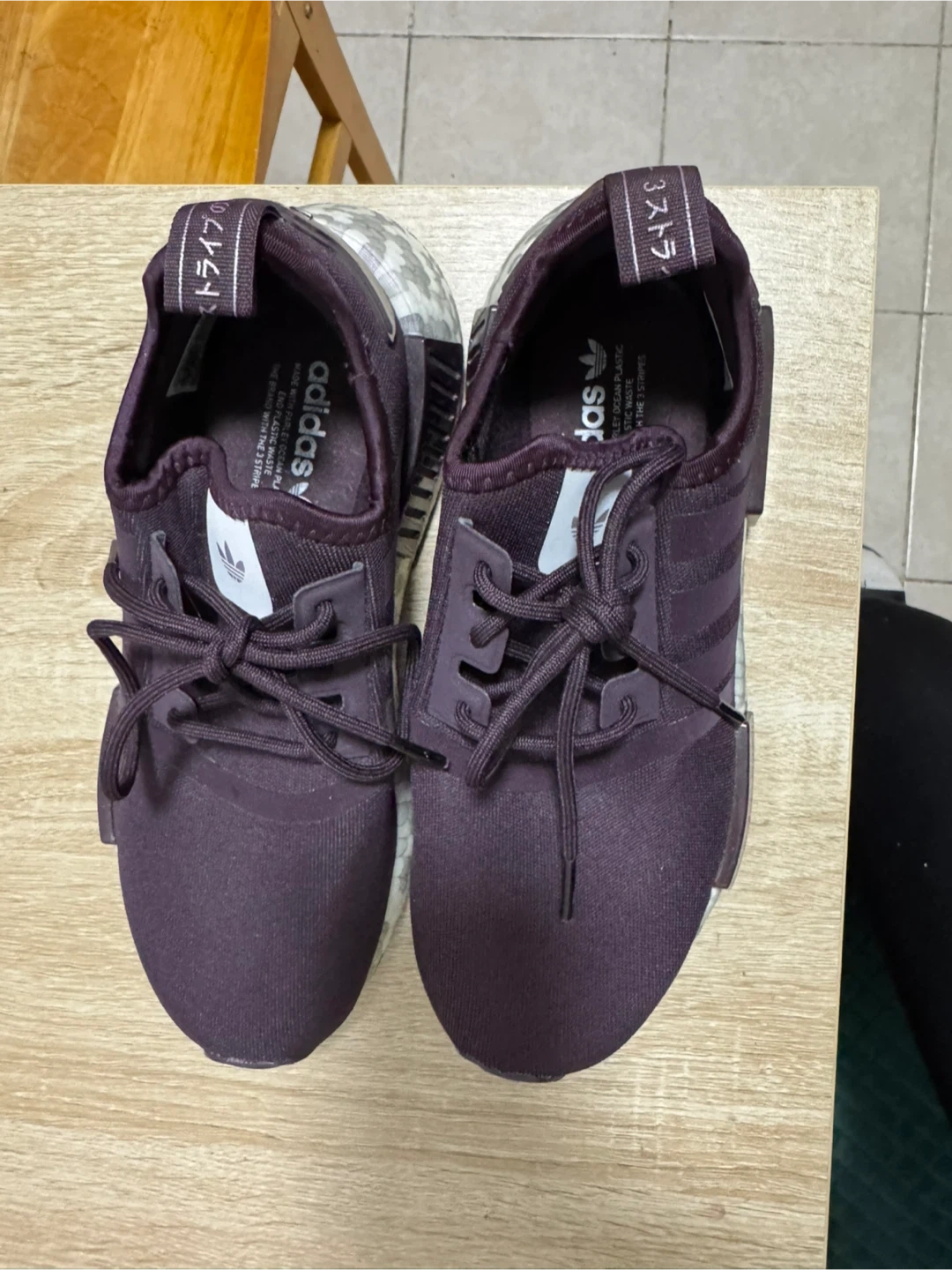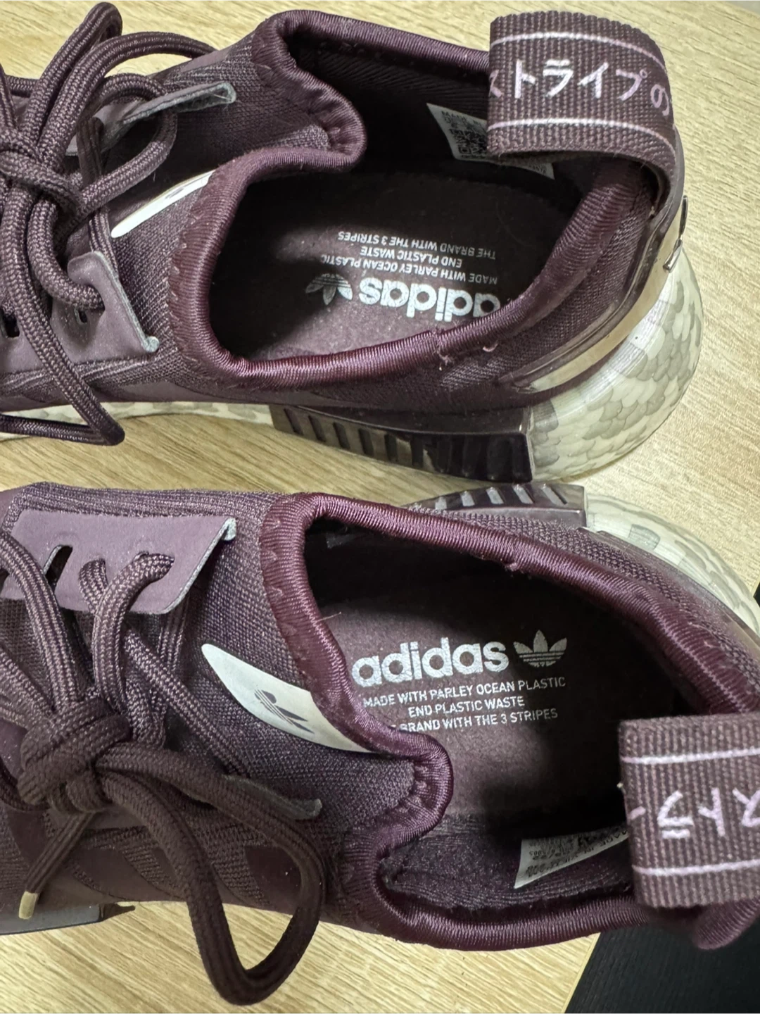 Selling a pair of Adidas NMD R1 sneakers in a stylish purple color. These shoes are made with Parley Ocean Plastic, contributing to Adidas's commitment to ending plastic waste. They feature the iconic 3 stripes and are designed for comfort and style. Perfect for everyday wear! Just used once