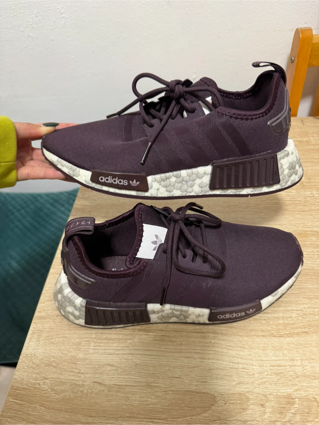 Selling a pair of Adidas NMD R1 sneakers in a stylish purple color. These shoes are made with Parley Ocean Plastic, contributing to Adidas's commitment to ending plastic waste. They feature the iconic 3 stripes and are designed for comfort and style. Perfect for everyday wear! Just used once