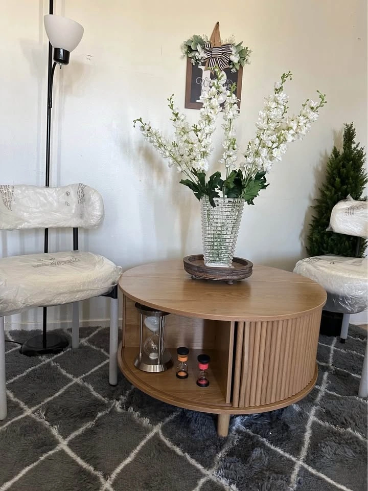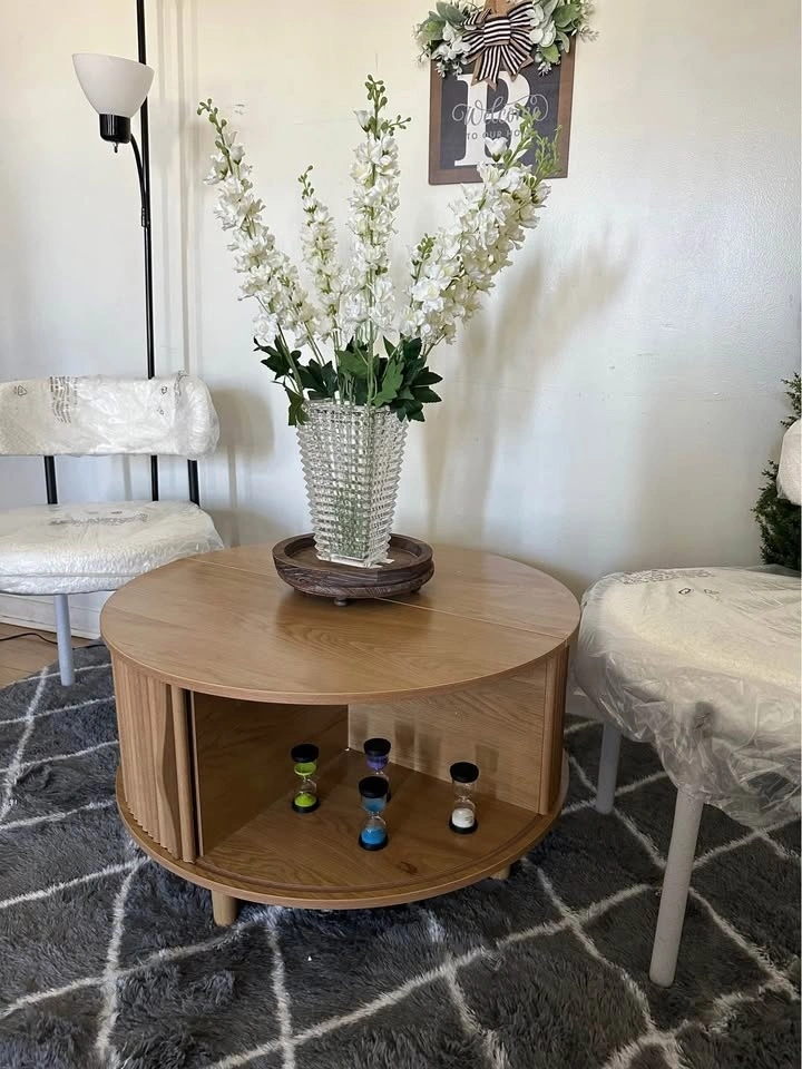 31.5 inch round side table with storage, mid-century modern coffee table with shelf and sliding door, small dining table with living room/ 2 colors available