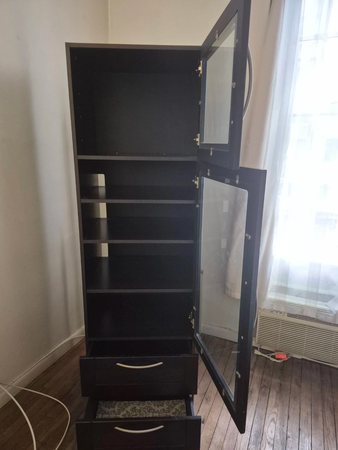 Tall storage cabinet in a dark ebony wood finish. It features two glass-fronted doors and two drawers at the bottom for extra storage. This unit offers a mix of open shelving and concealed storage.