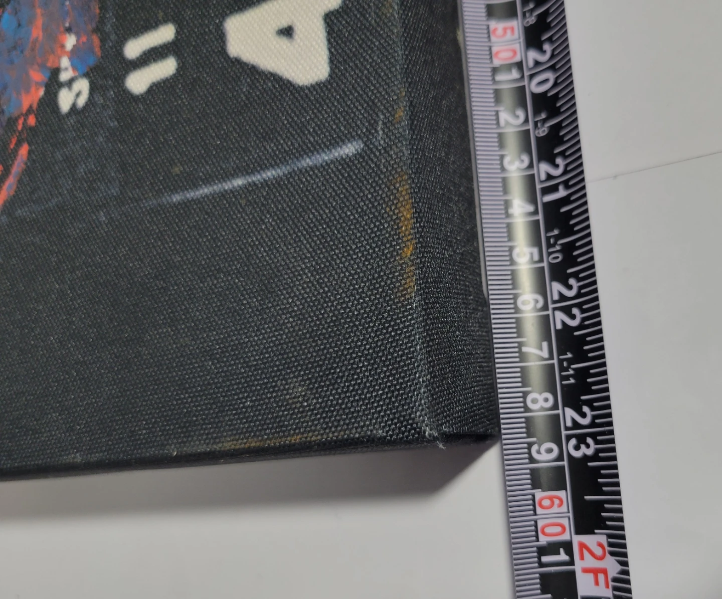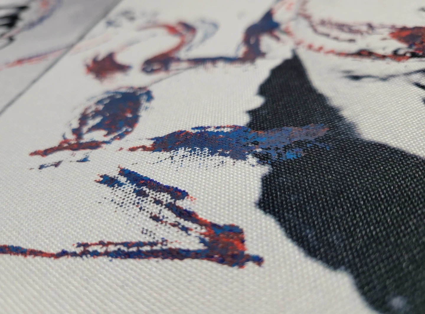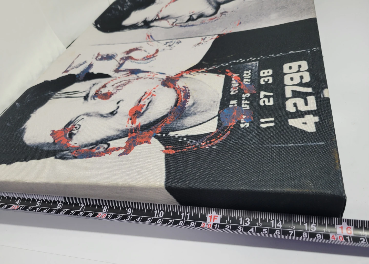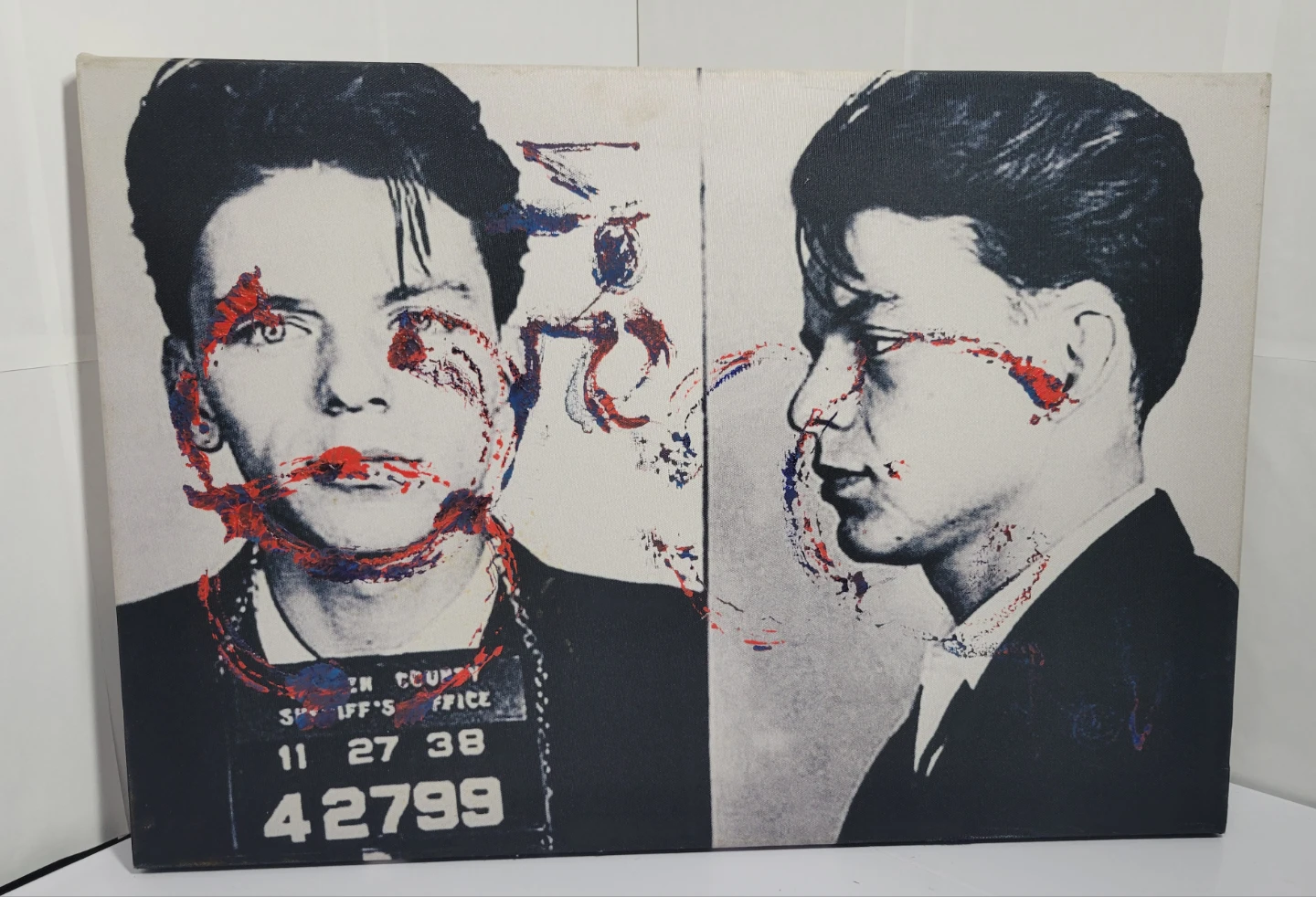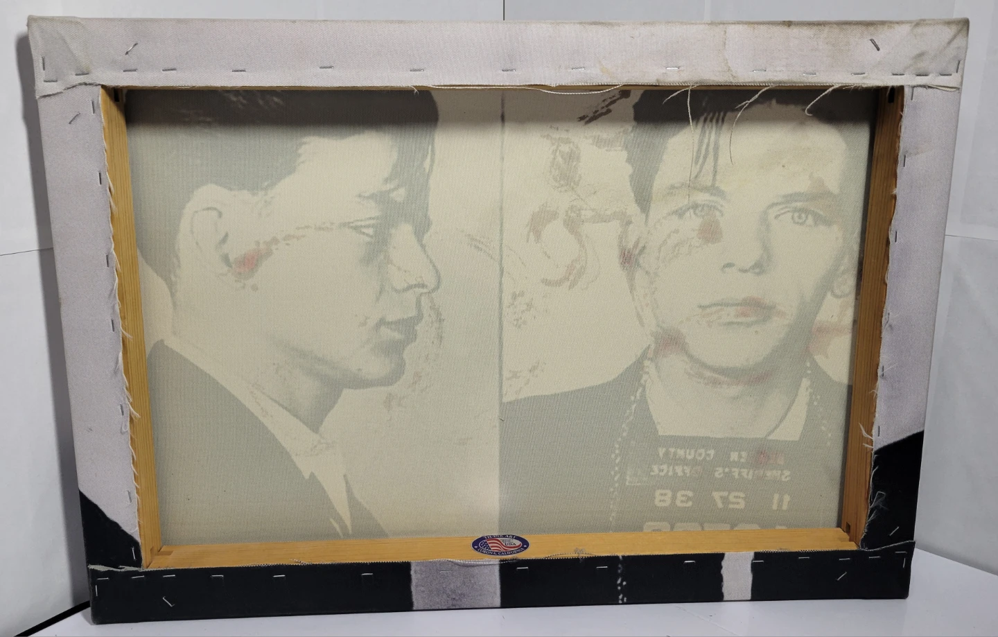 Canvas art print featuring a mugshot style image. Some staining and wear are present on the fabric edges. Ready to hang artwork.