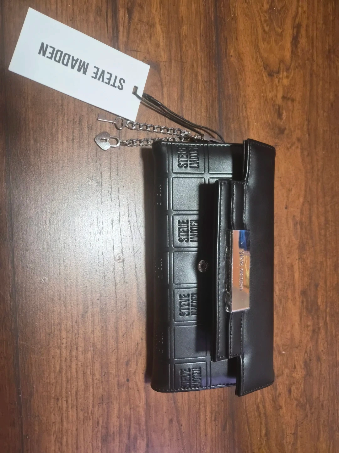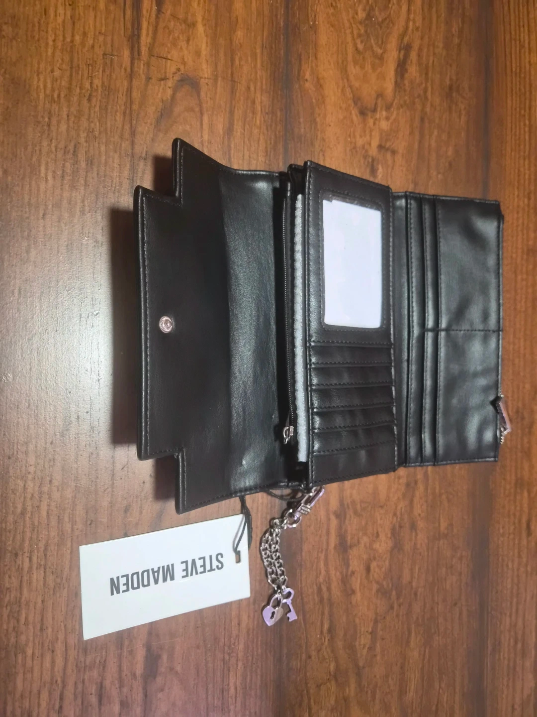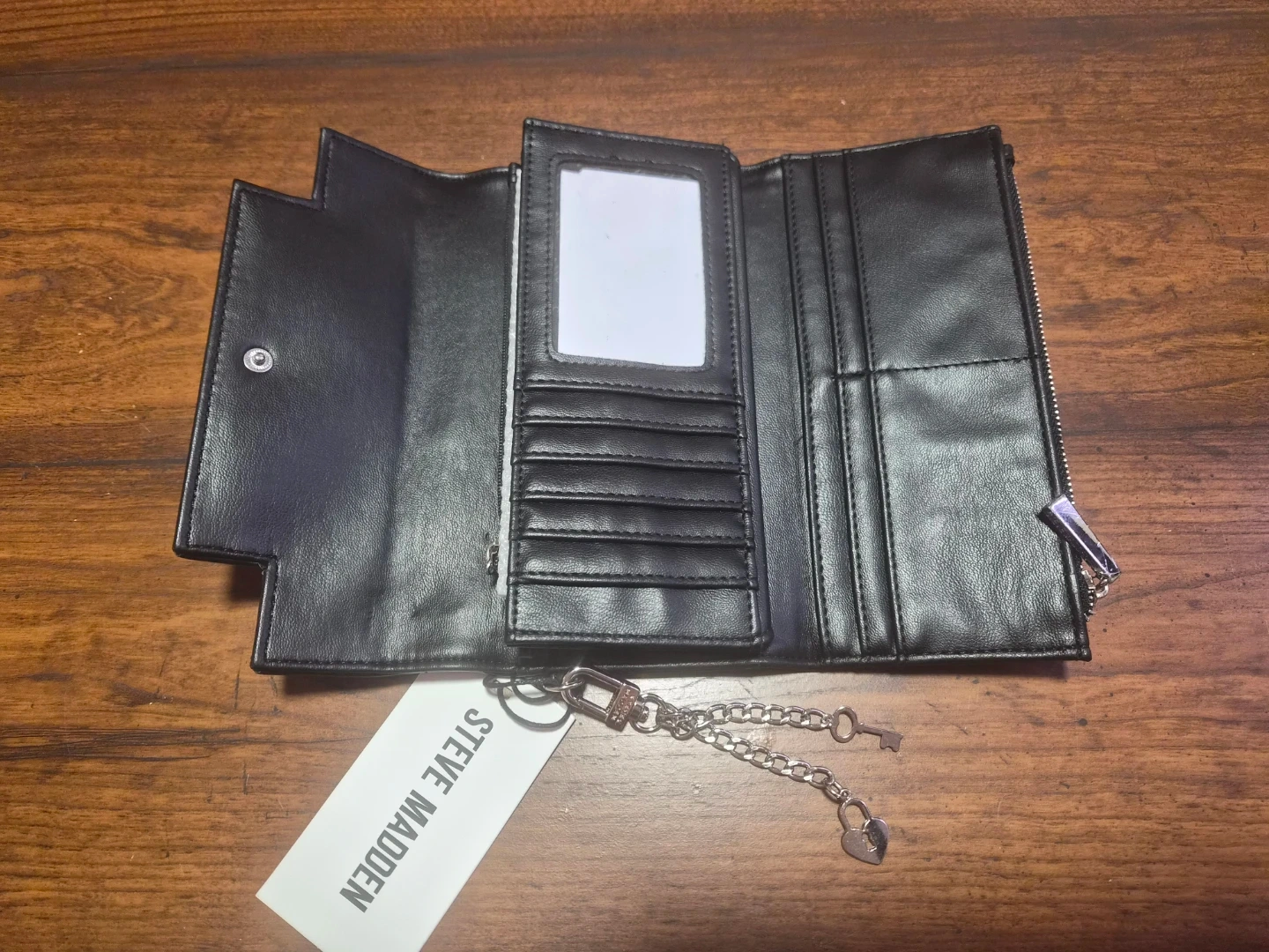 This is a black Steve Madden wallet. It features multiple card slots, a zippered coin pouch, and a clear ID window. It also comes with a decorative chain charm with a heart and key accent.