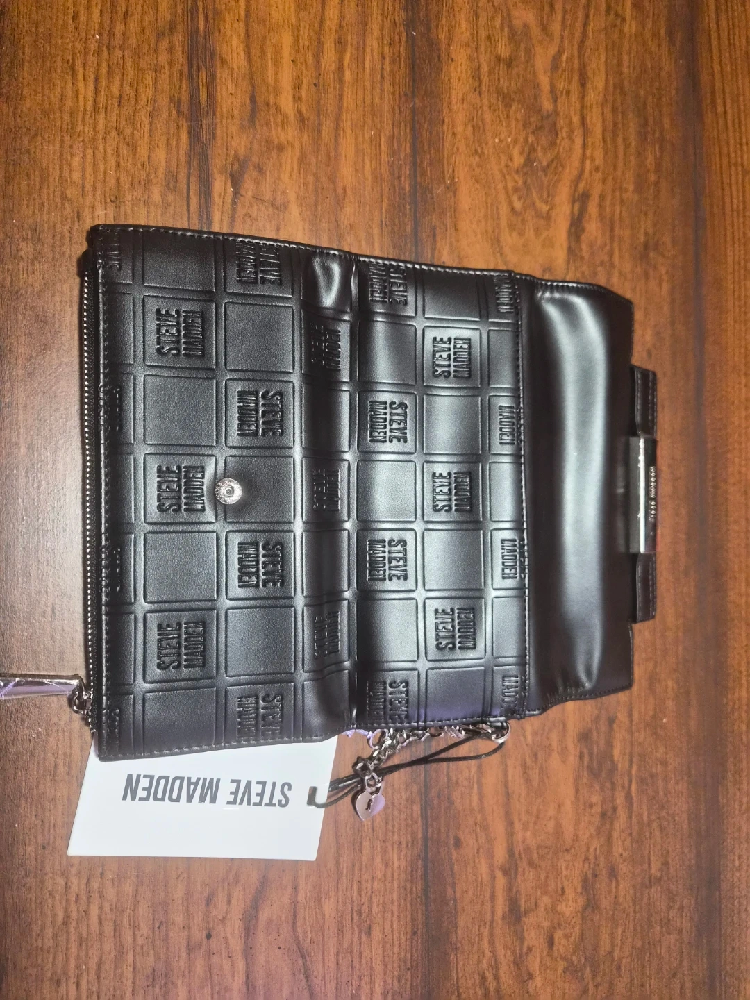 This is a black Steve Madden wallet. It features multiple card slots, a zippered coin pouch, and a clear ID window. It also comes with a decorative chain charm with a heart and key accent.