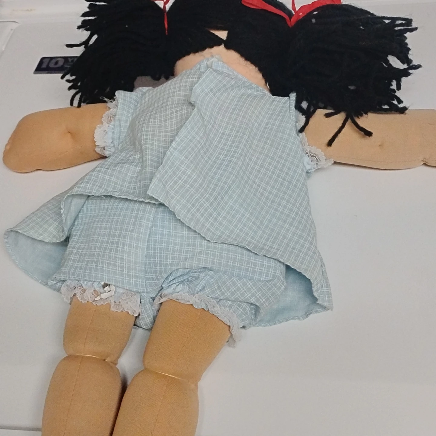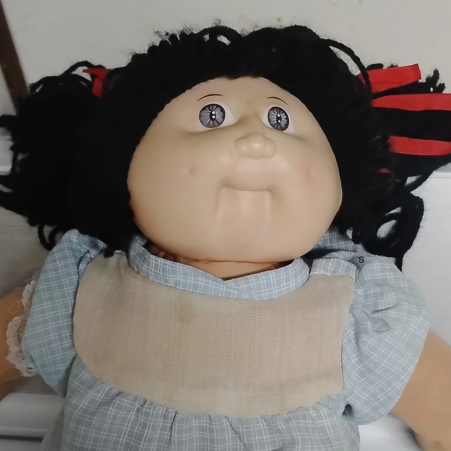 This is a Cabbage Patch Kid doll with black yarn hair in pigtails and red bows. She's wearing a blue plaid dress with a tan apron over it. The doll has a soft body and plastic face.