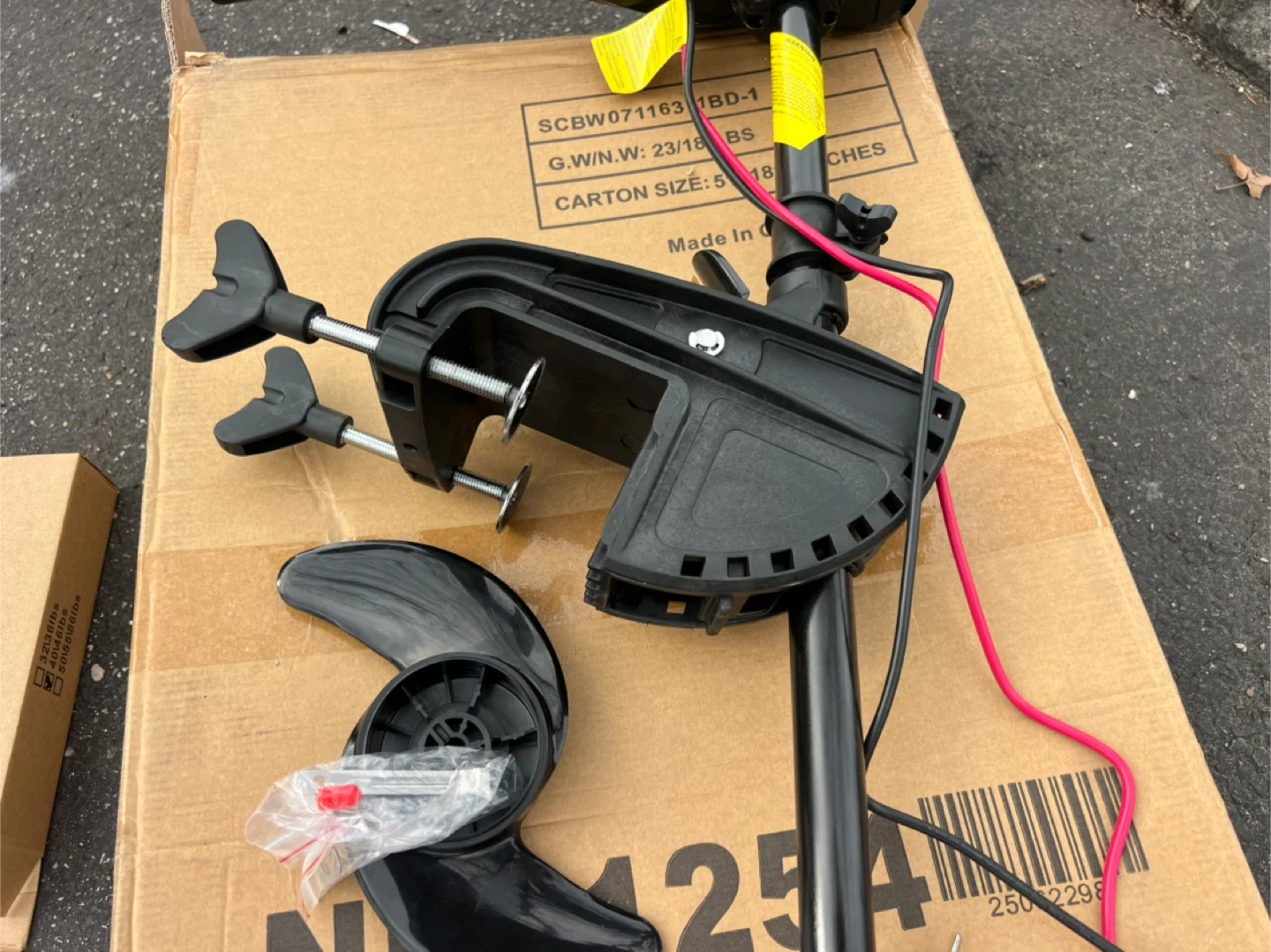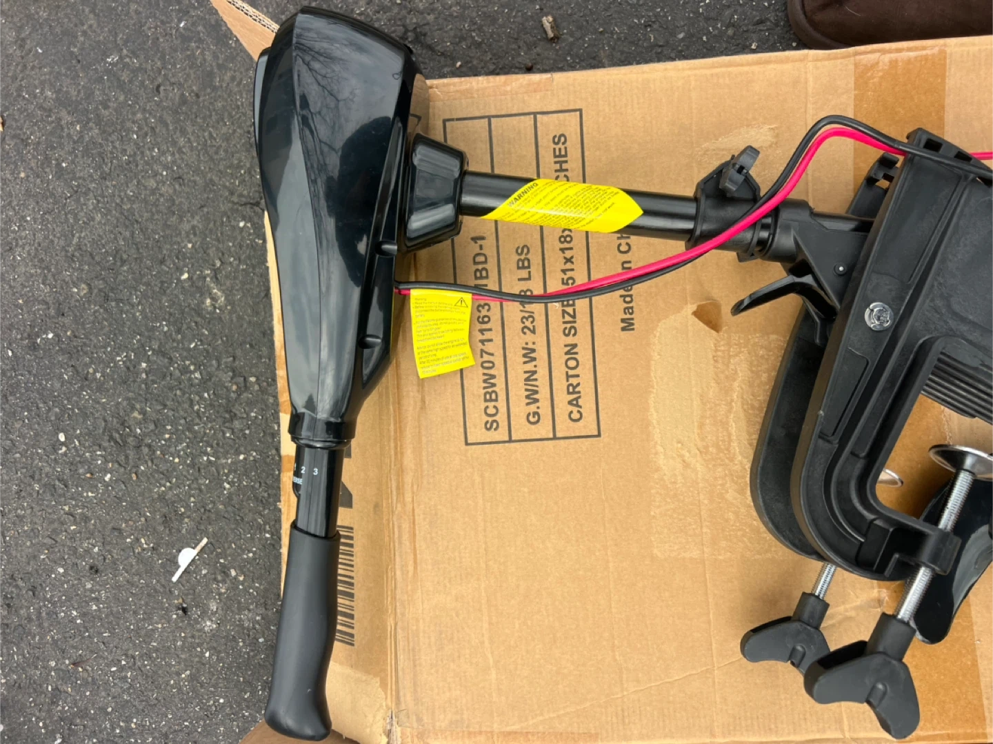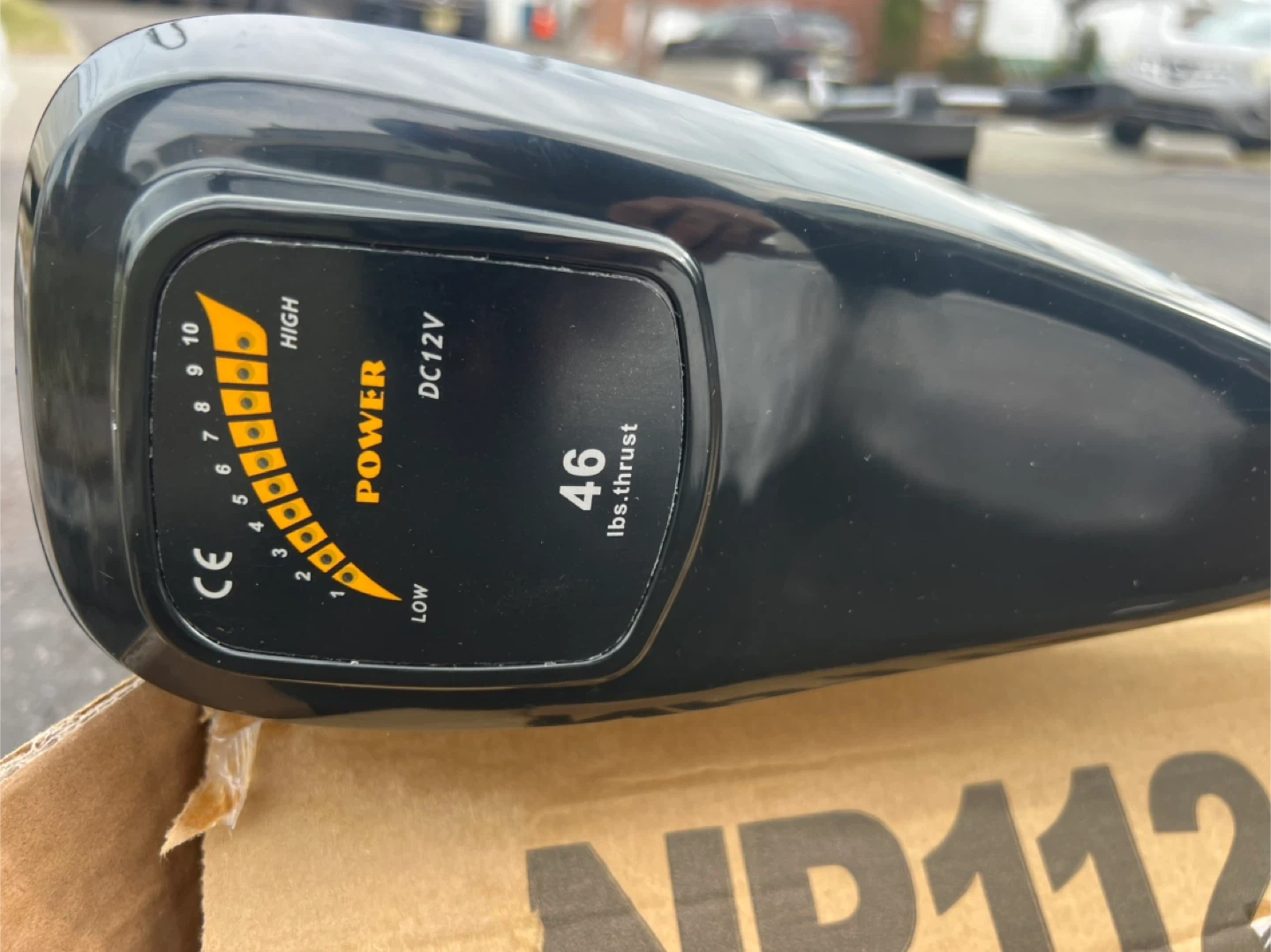 This is a black electric trolling motor with 46 lbs of thrust and a DC 12V power requirement. It includes a propeller and mounting hardware. It's suitable for small boats or kayaks. Comes in original box.