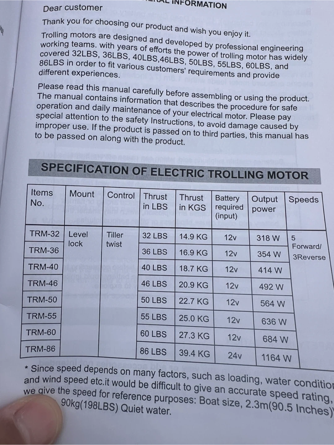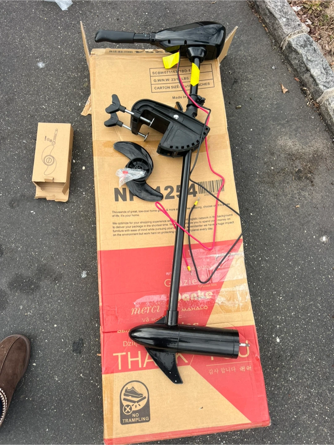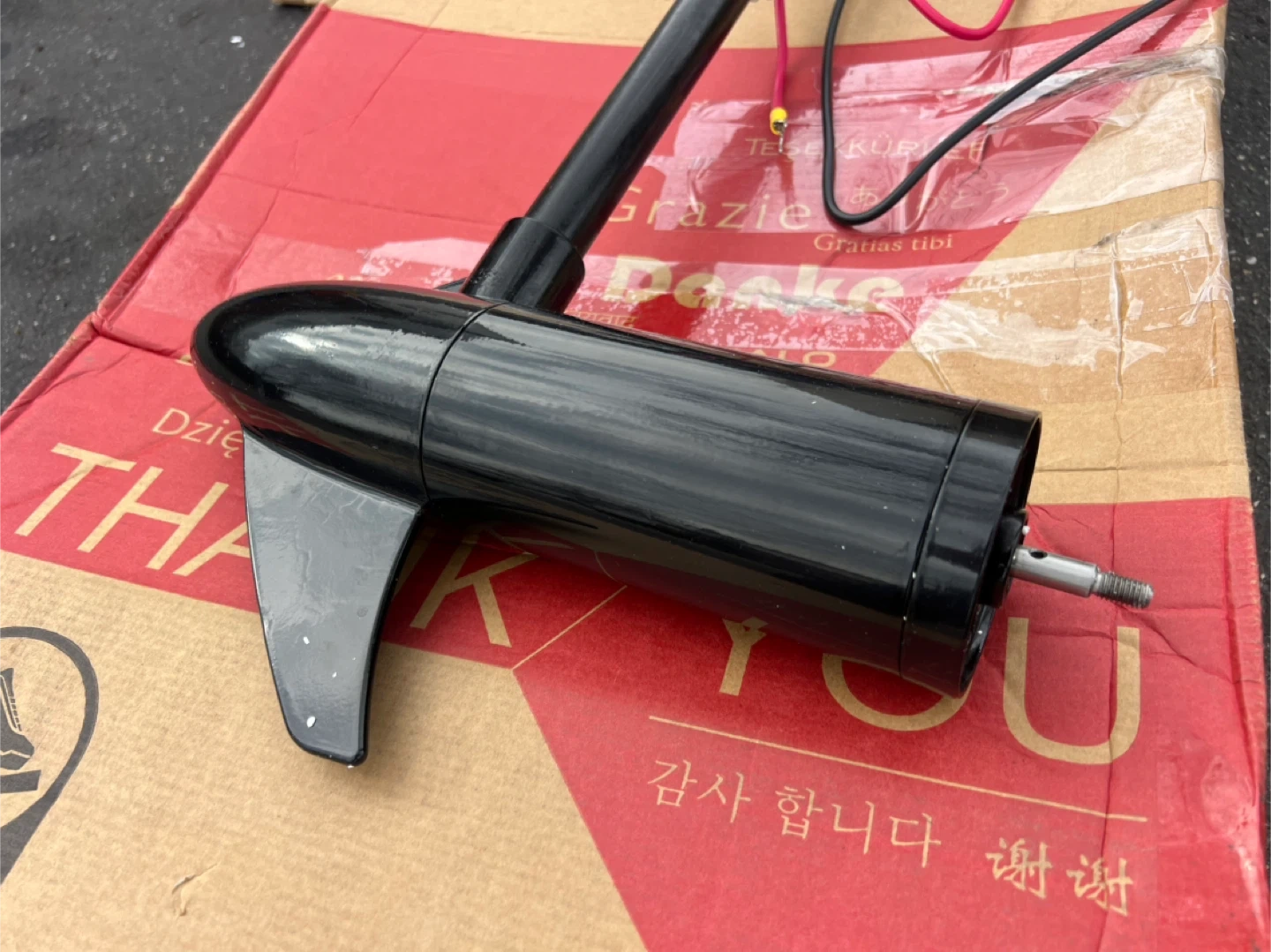 This is a black electric trolling motor with 46 lbs of thrust and a DC 12V power requirement. It includes a propeller and mounting hardware. It's suitable for small boats or kayaks. Comes in original box.