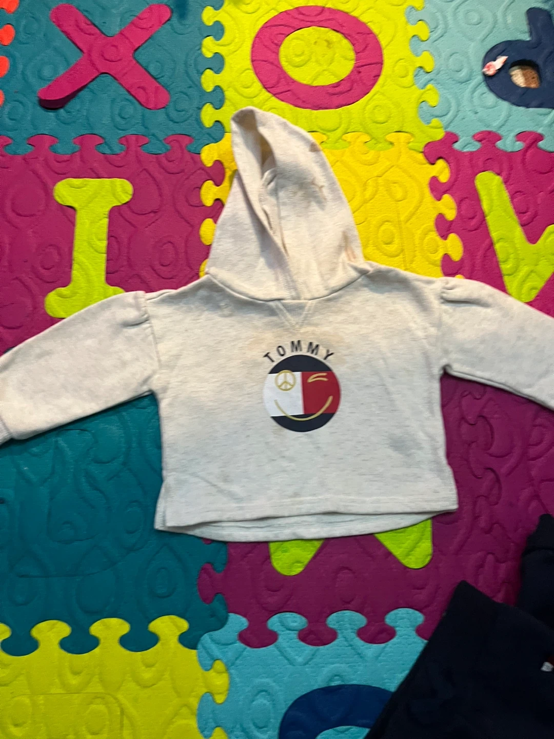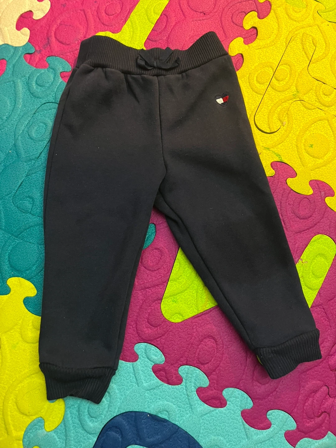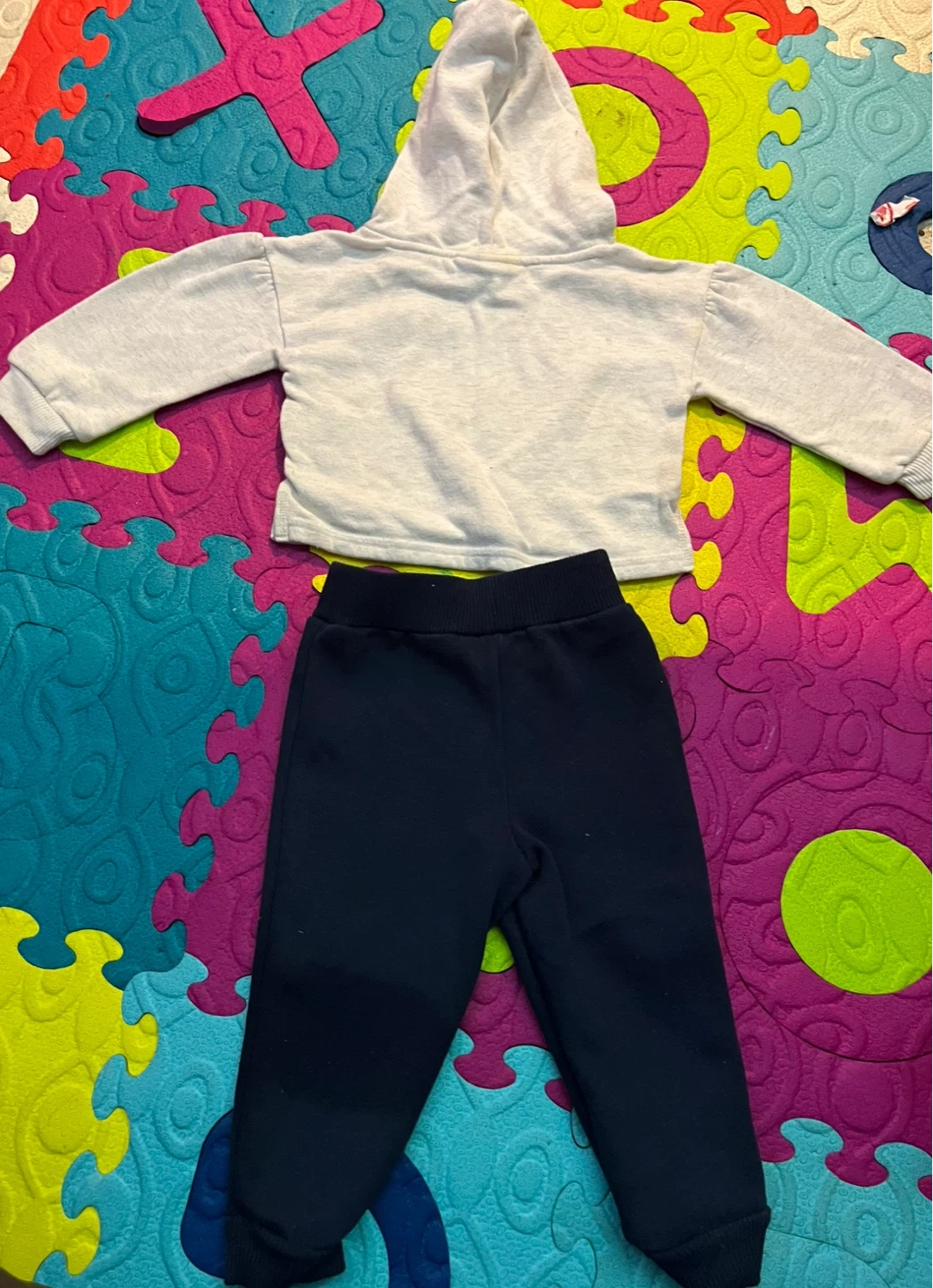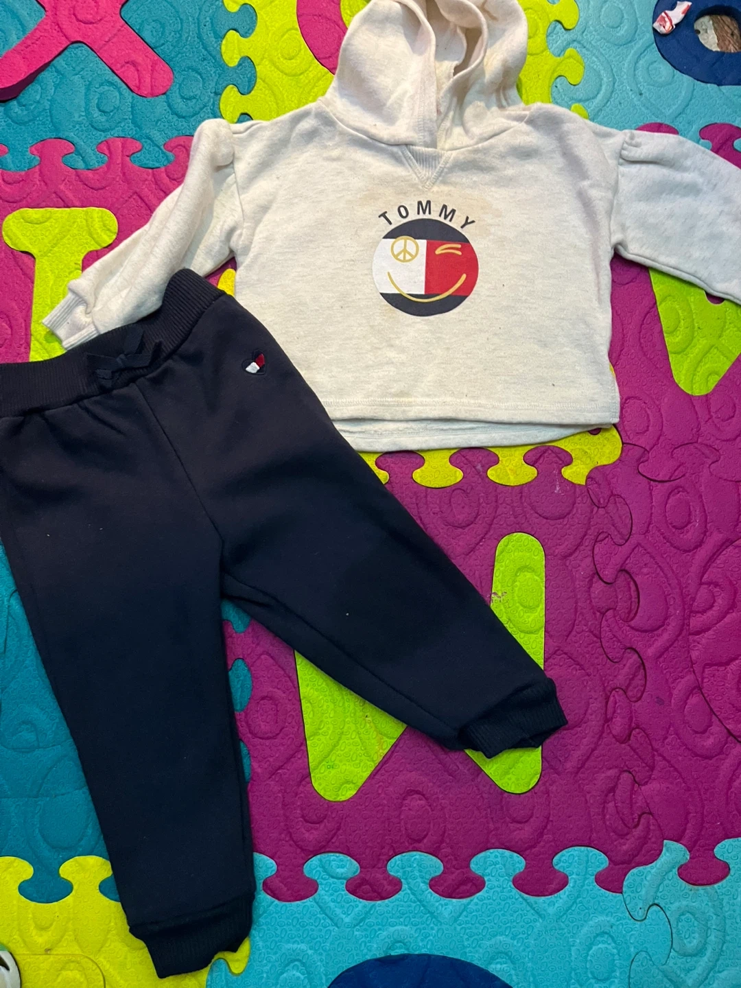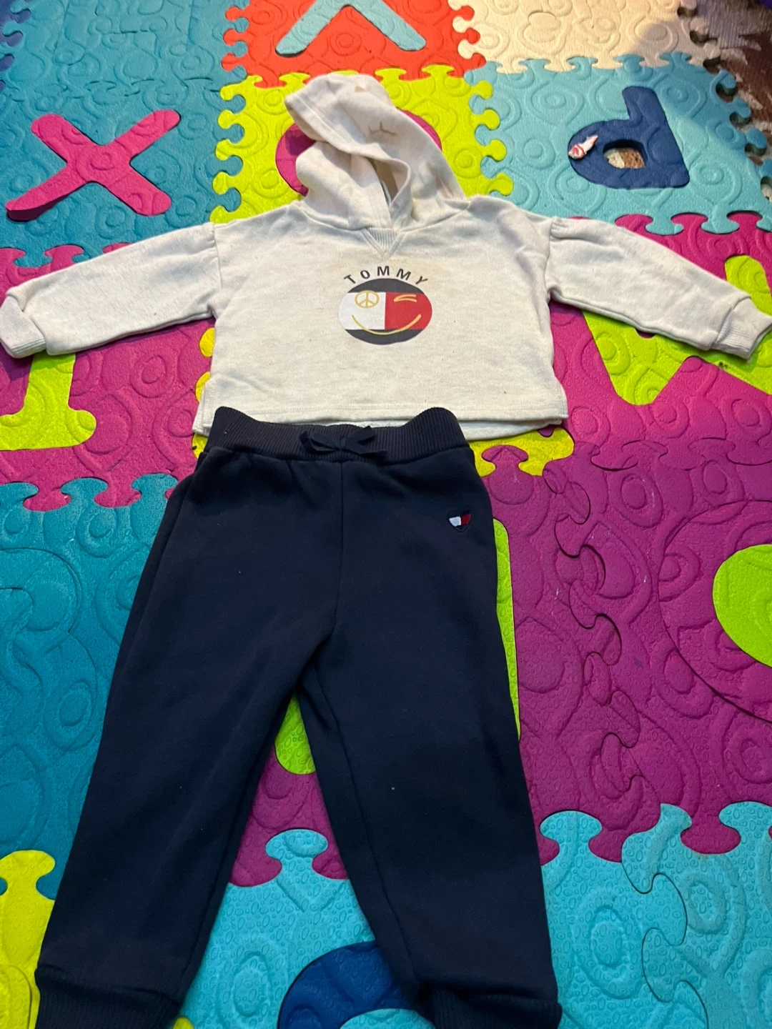 This is a Tommy Hilfiger baby hoodie and jogger set. The hoodie is light heather grey with a graphic logo. The joggers are navy blue with a drawstring waist. Cotton blend material.