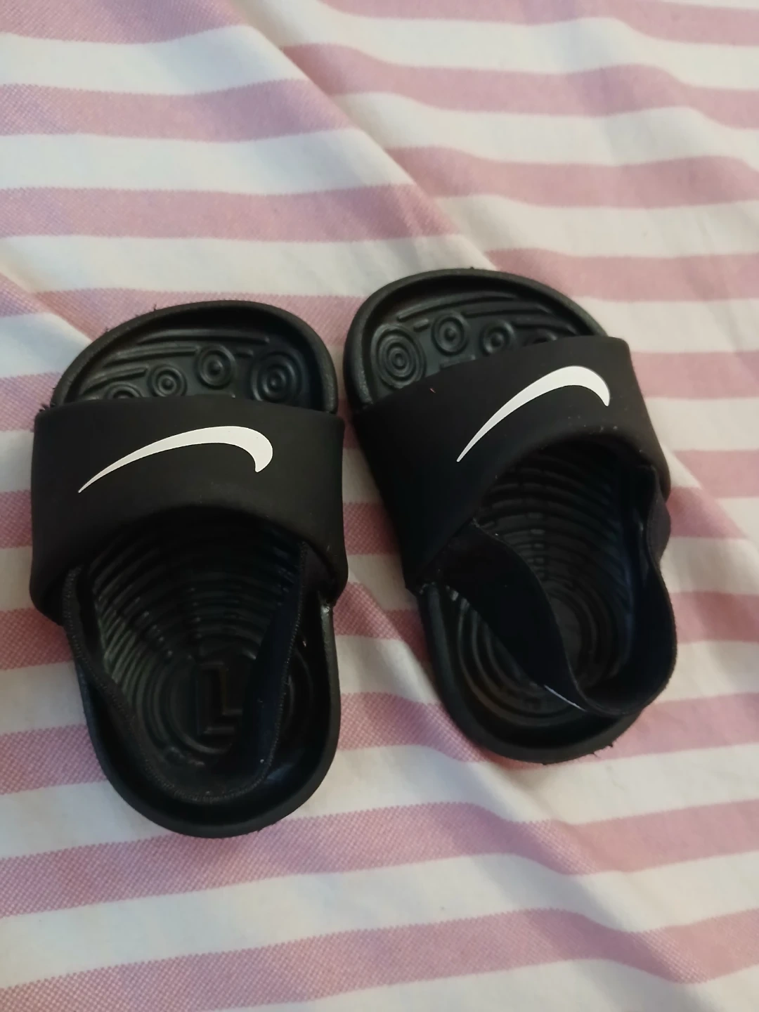 These are infant Nike slides. They're black with a white Nike swoosh. Comes with a heel strap for a secure fit.