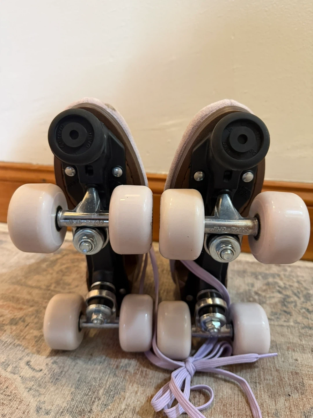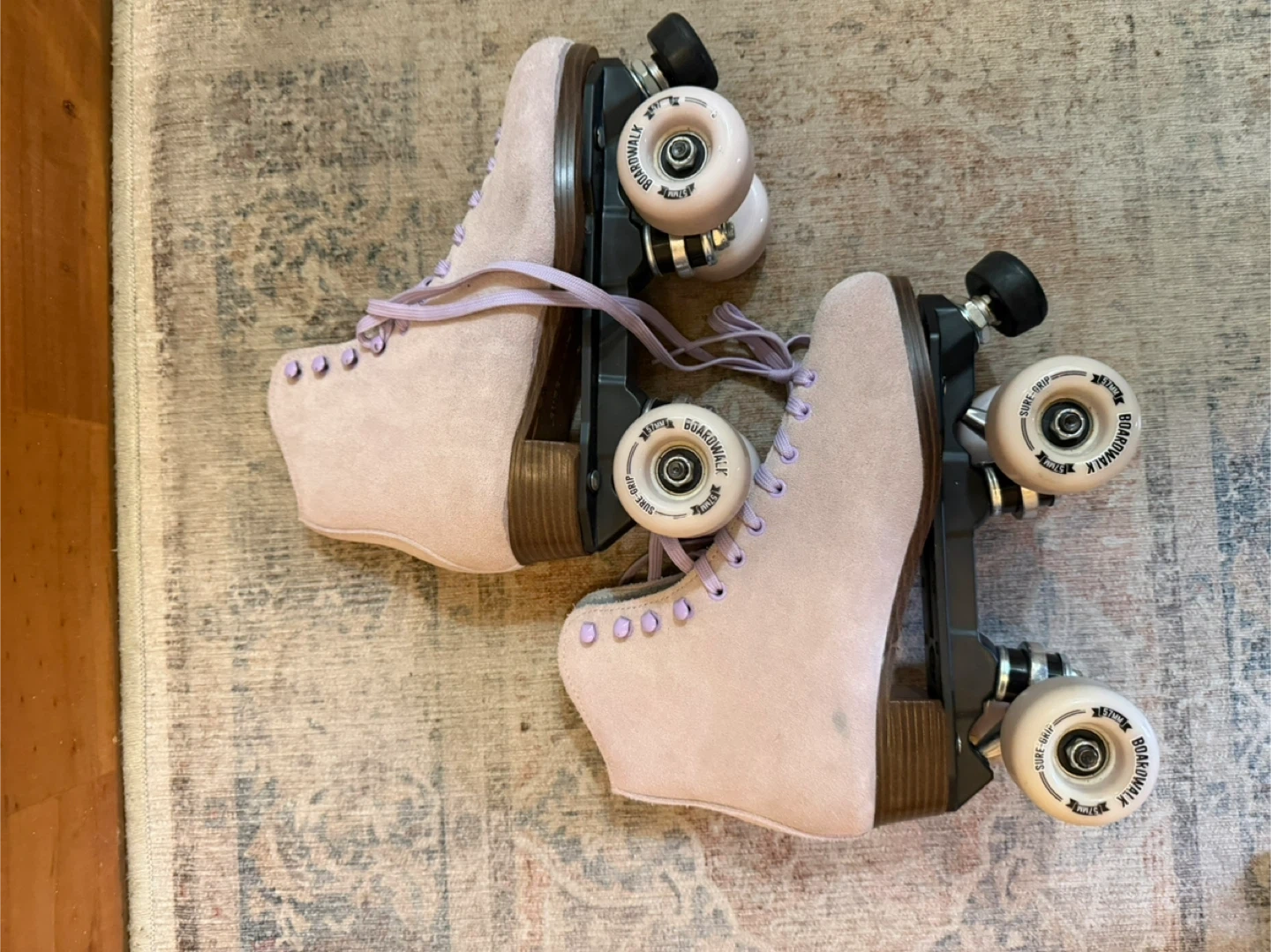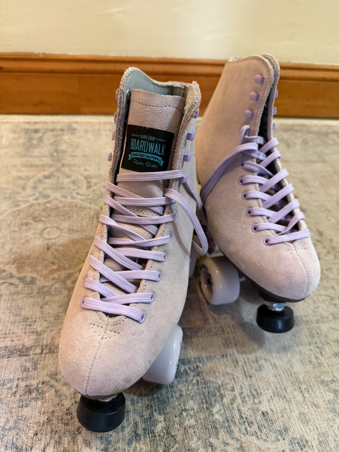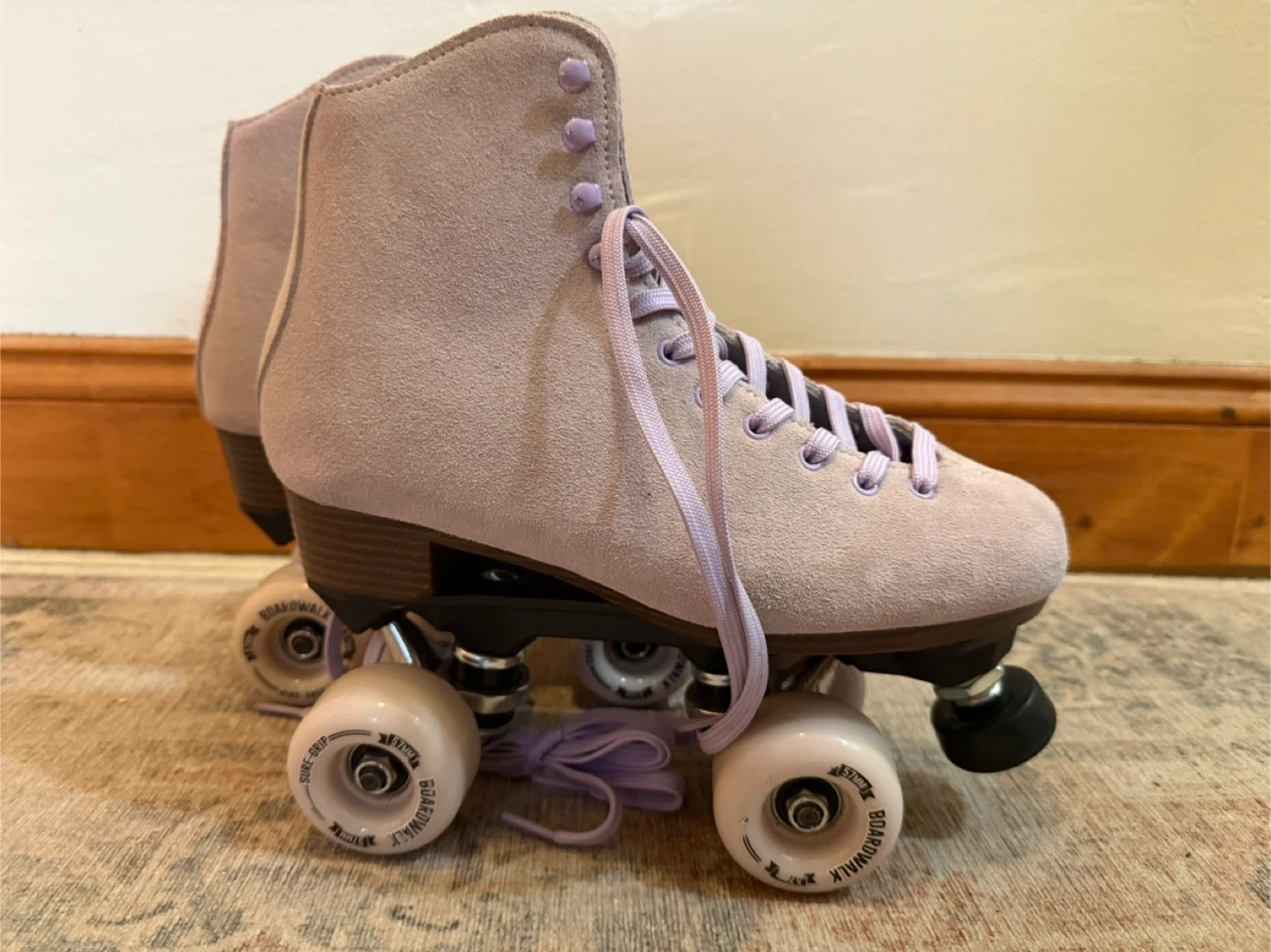 These Sure-Grip Boardwalk roller skates are in a light lavender suede. They're designed for a comfortable fit and smooth ride. Skates have a durable construction and reliable wheels.