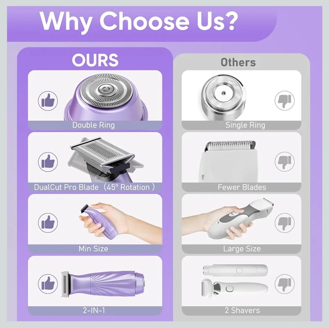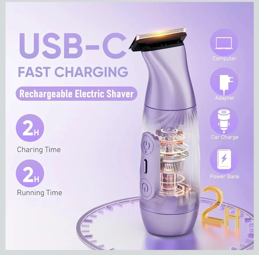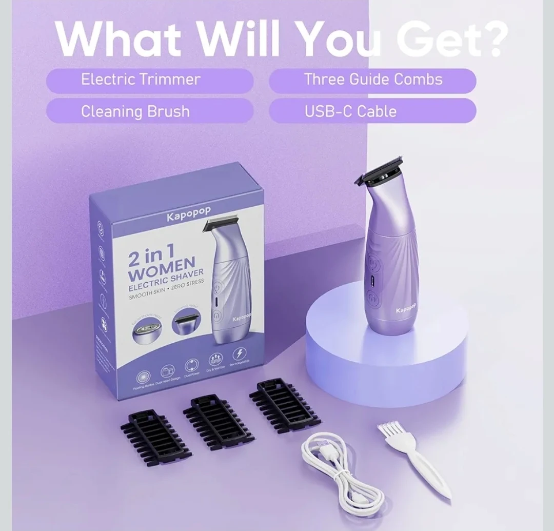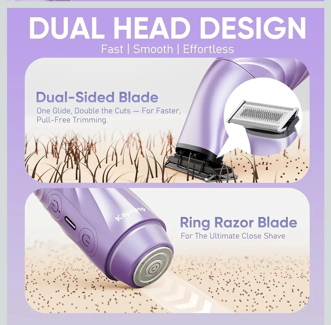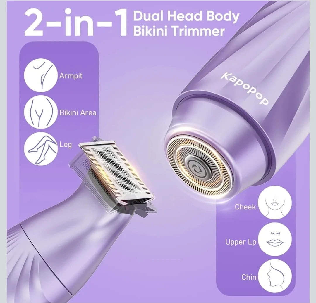 2-in-1 Bikini Trimmer for Women,Electric Shaver & Razor with Dual Heads for Body Pubic Underarm & Facial Hair,IPX7 Waterproof Wet & Dry,Rechargeable Cordless Lady Trimmer
