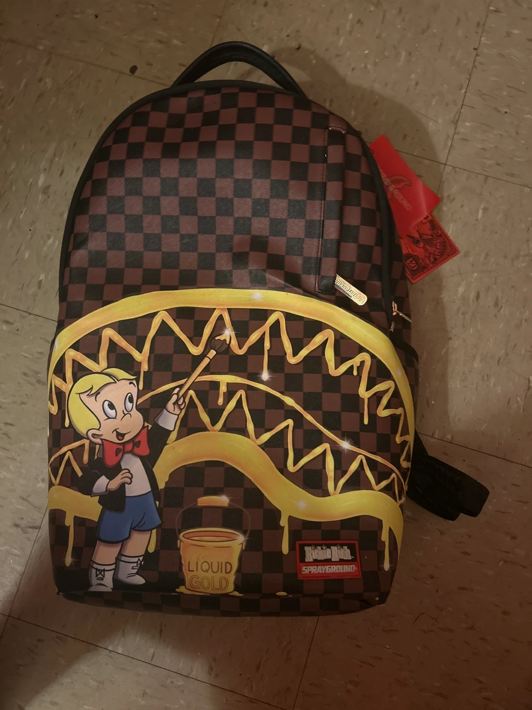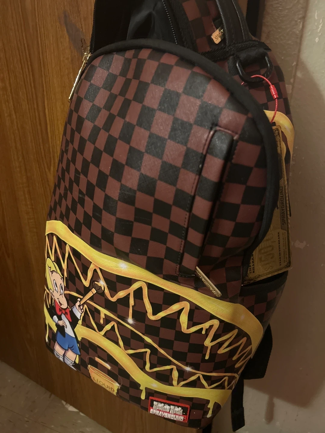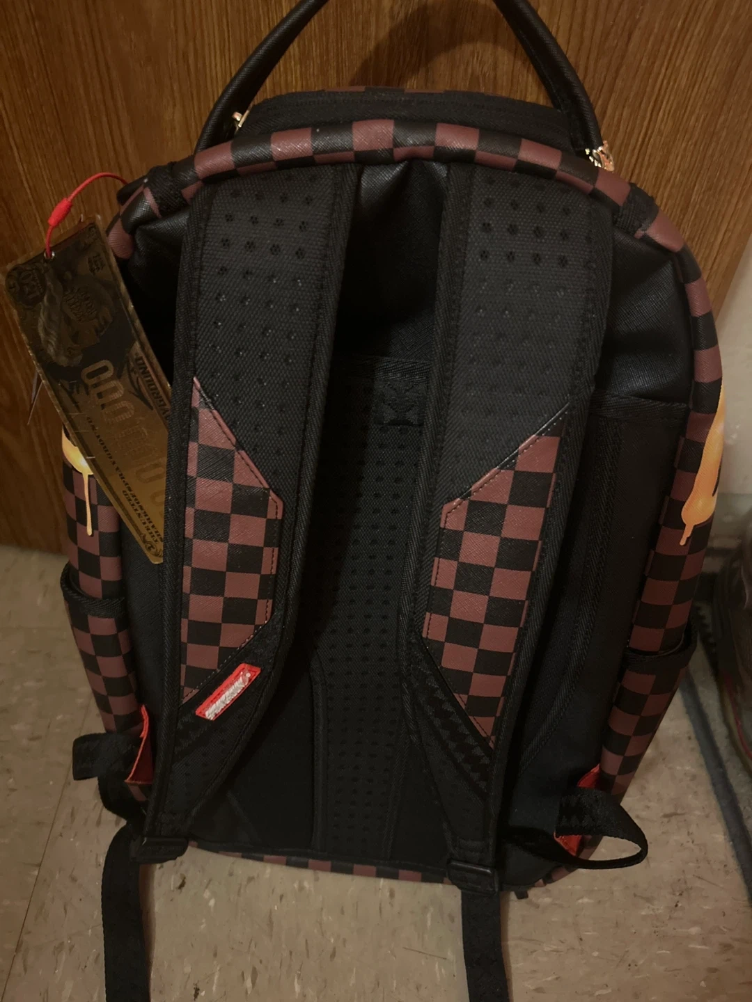Selling a Sprayground backpack with a unique design! It features a checkerboard pattern in brown and black, with a cartoon graphic on the bottom. Great for carrying your essentials in style!