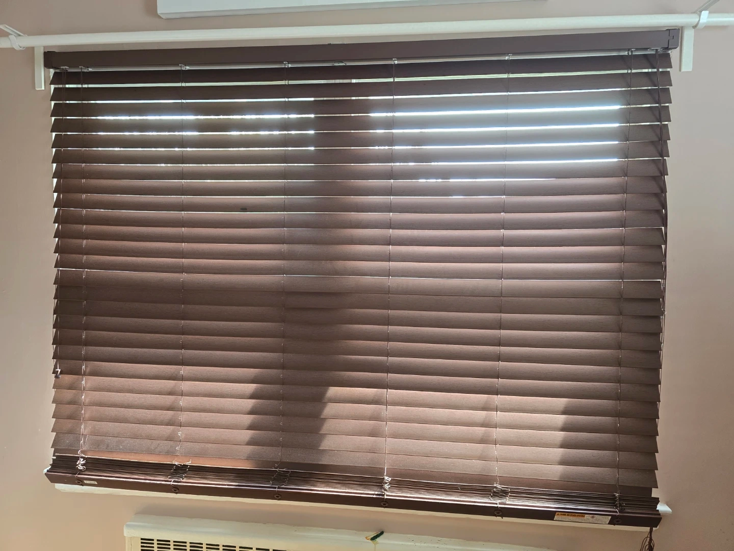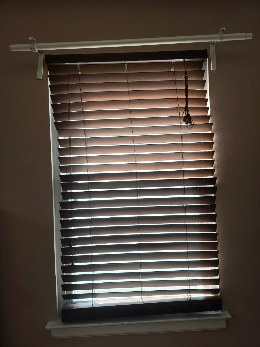 Wooden blinds in a rich brown color. These blinds offer privacy and light control. They're easy to operate with a pull cord system.