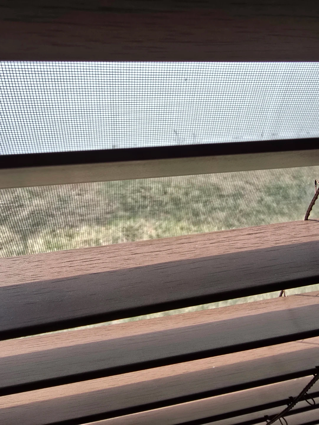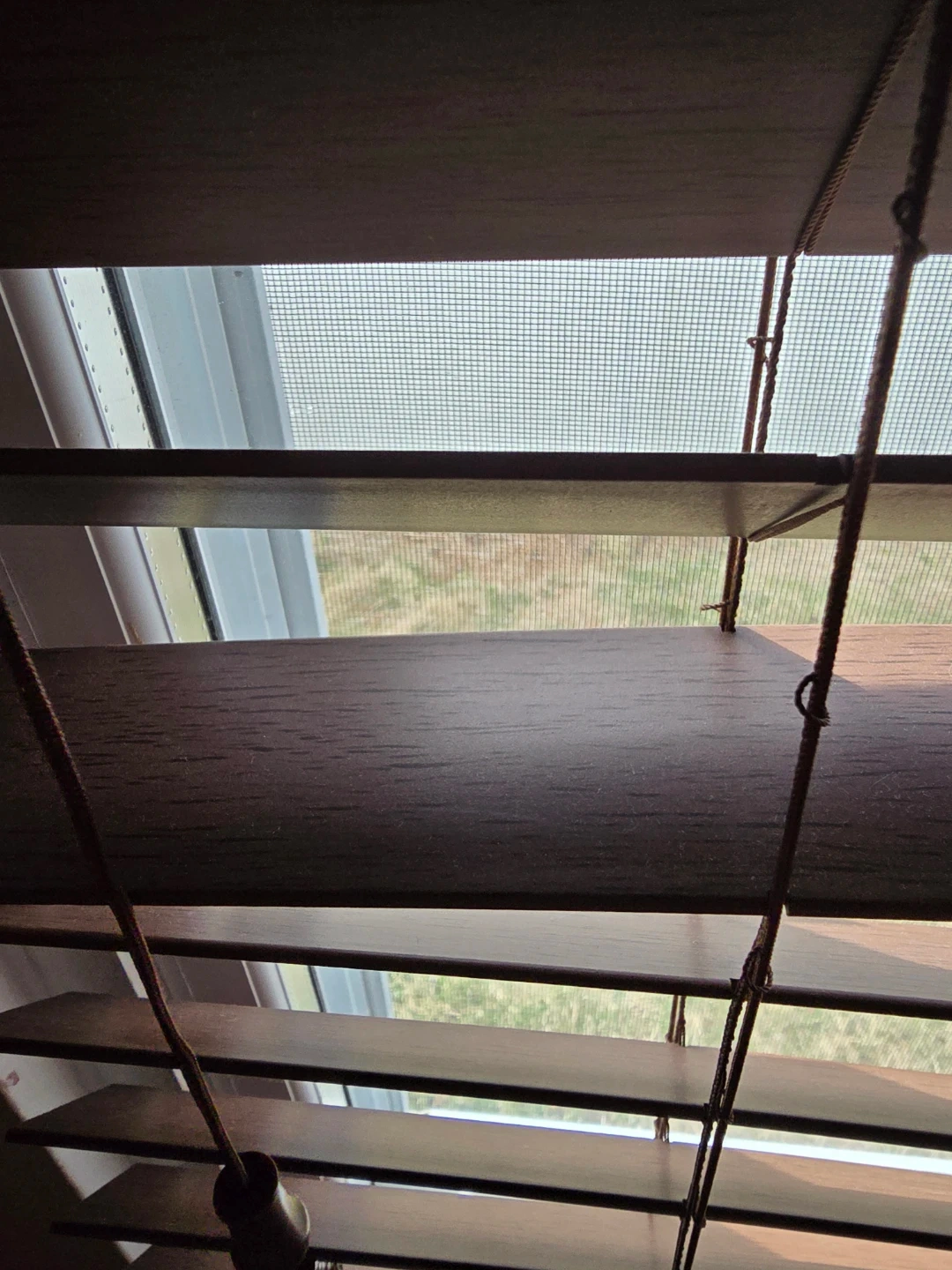 Wooden blinds in a rich brown color. These blinds offer privacy and light control. They're easy to operate with a pull cord system.