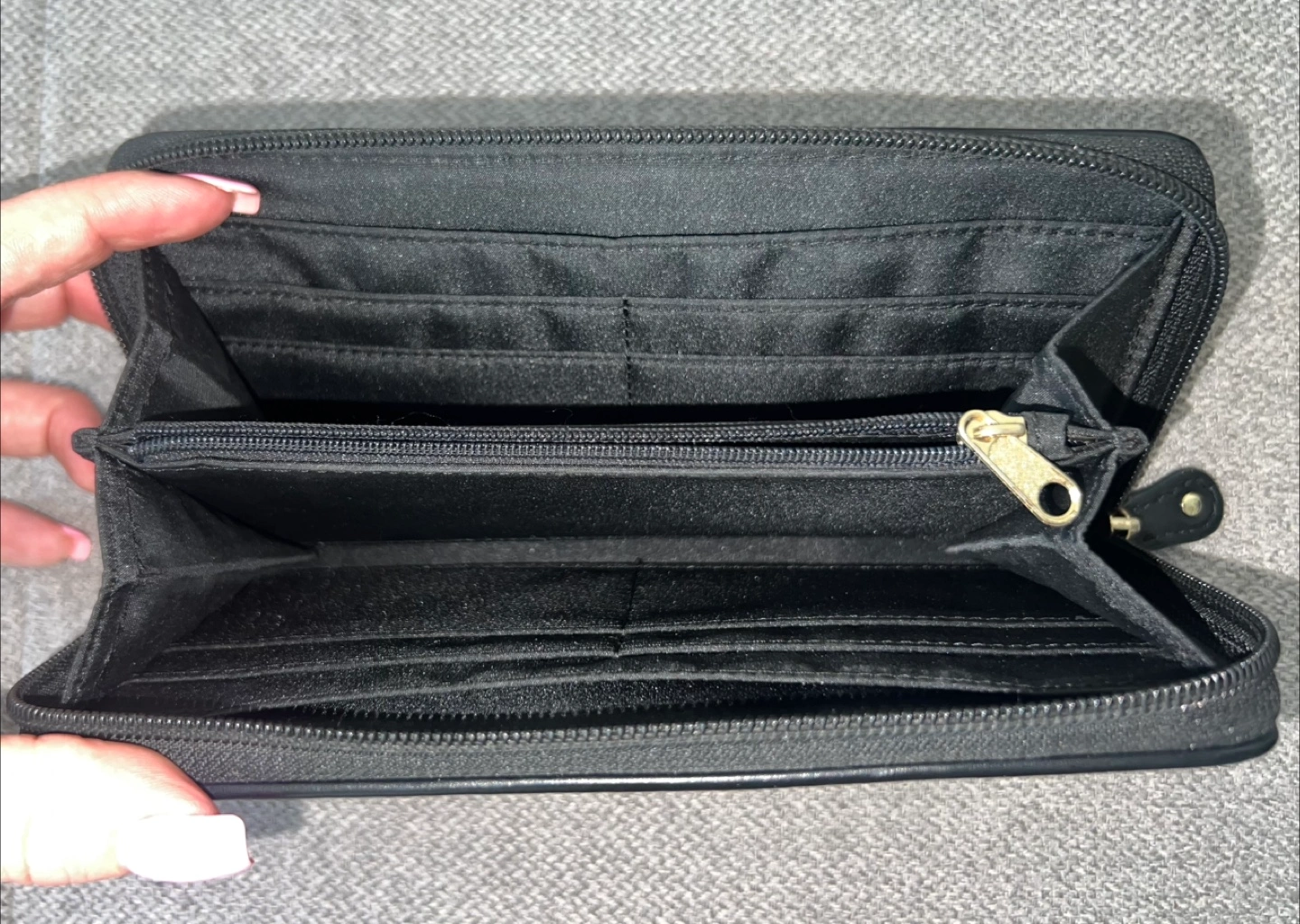 It is a long, continental-style wallet designed with a zip-around closure for security. The interior is equipped with multiple compartments for organization, including various card slots, two universal slip pockets, and an internal zippered coin pocket.