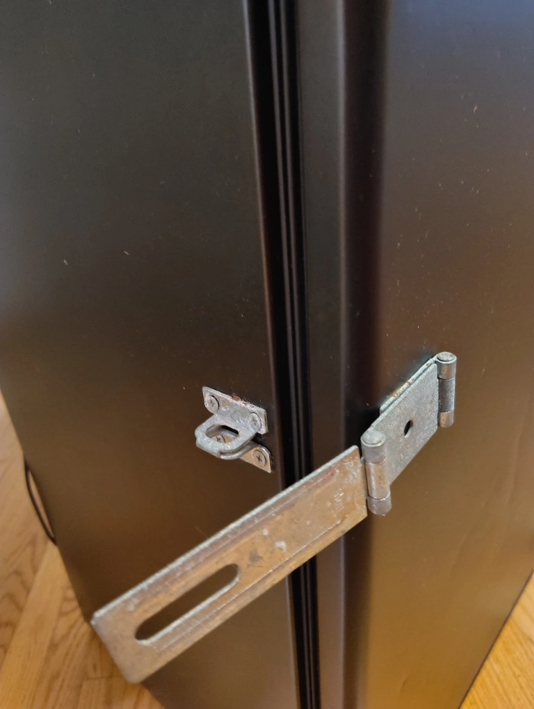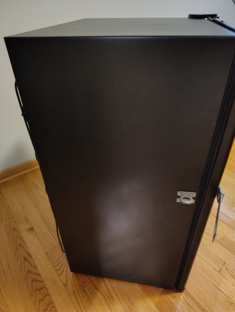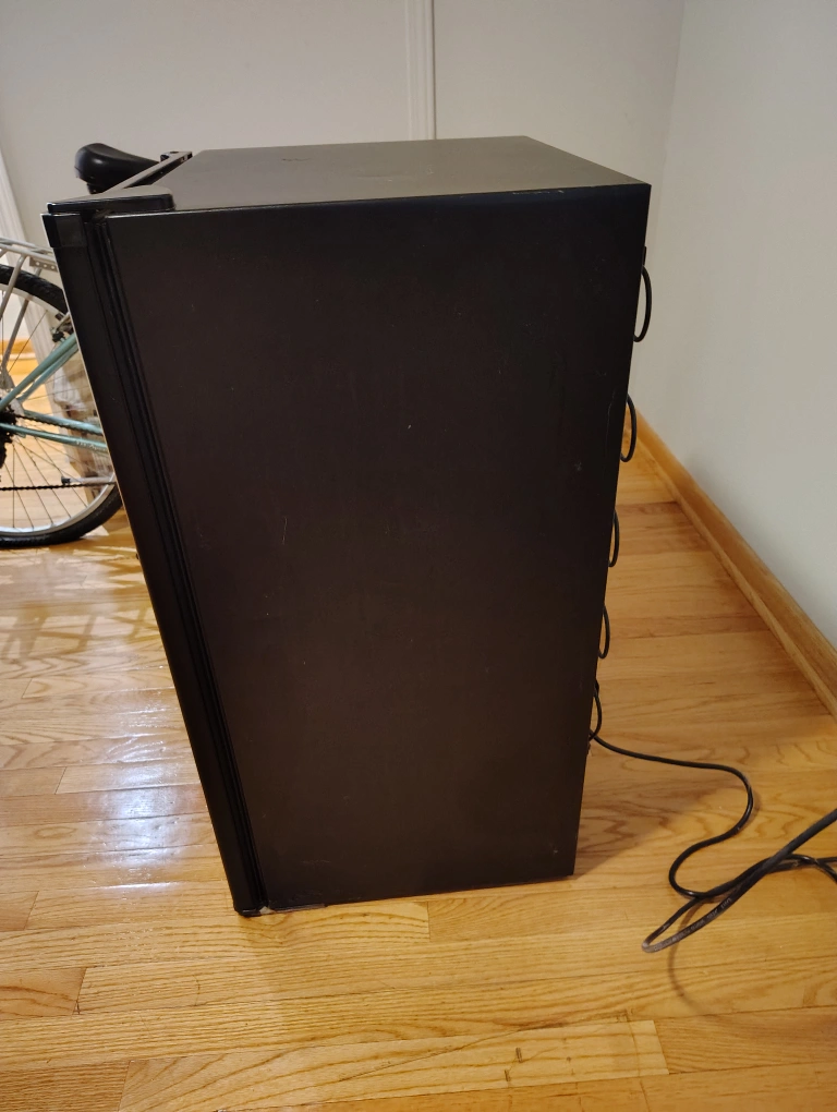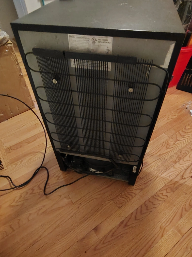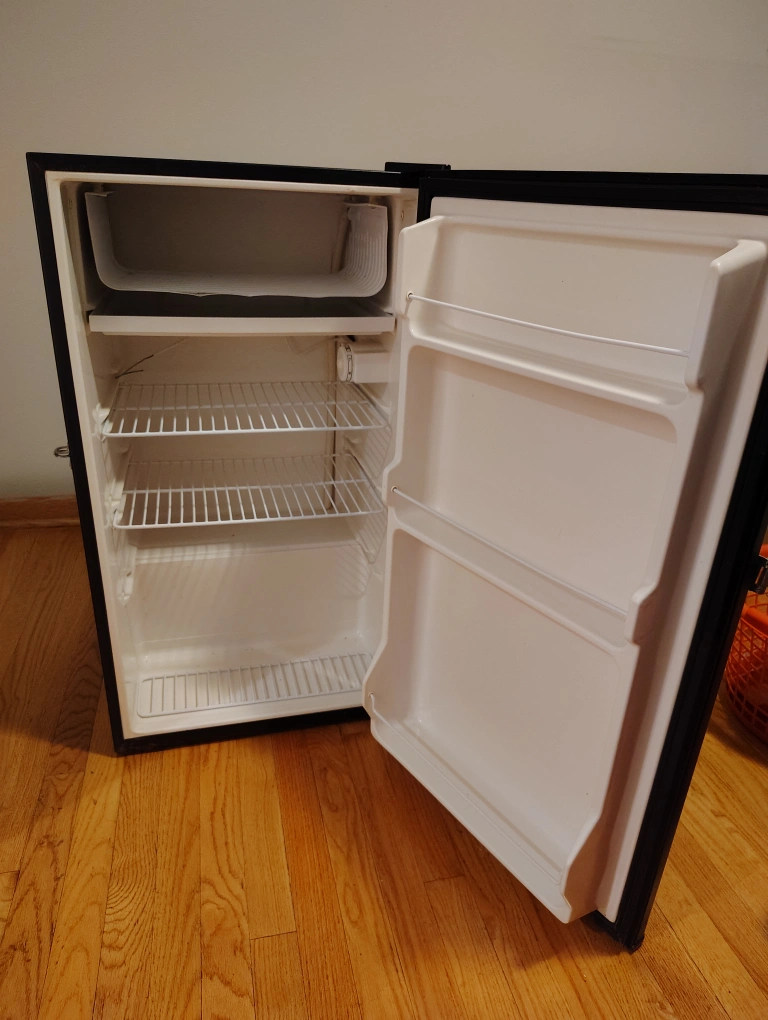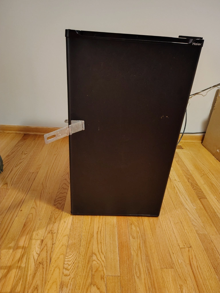 Selling a Haier compact refrigerator in black. It's in good condition and perfect for a dorm room, office, or small apartment. It has shelves inside and storage on the door. Great for keeping drinks and snacks cold! Has a lock on it too.
