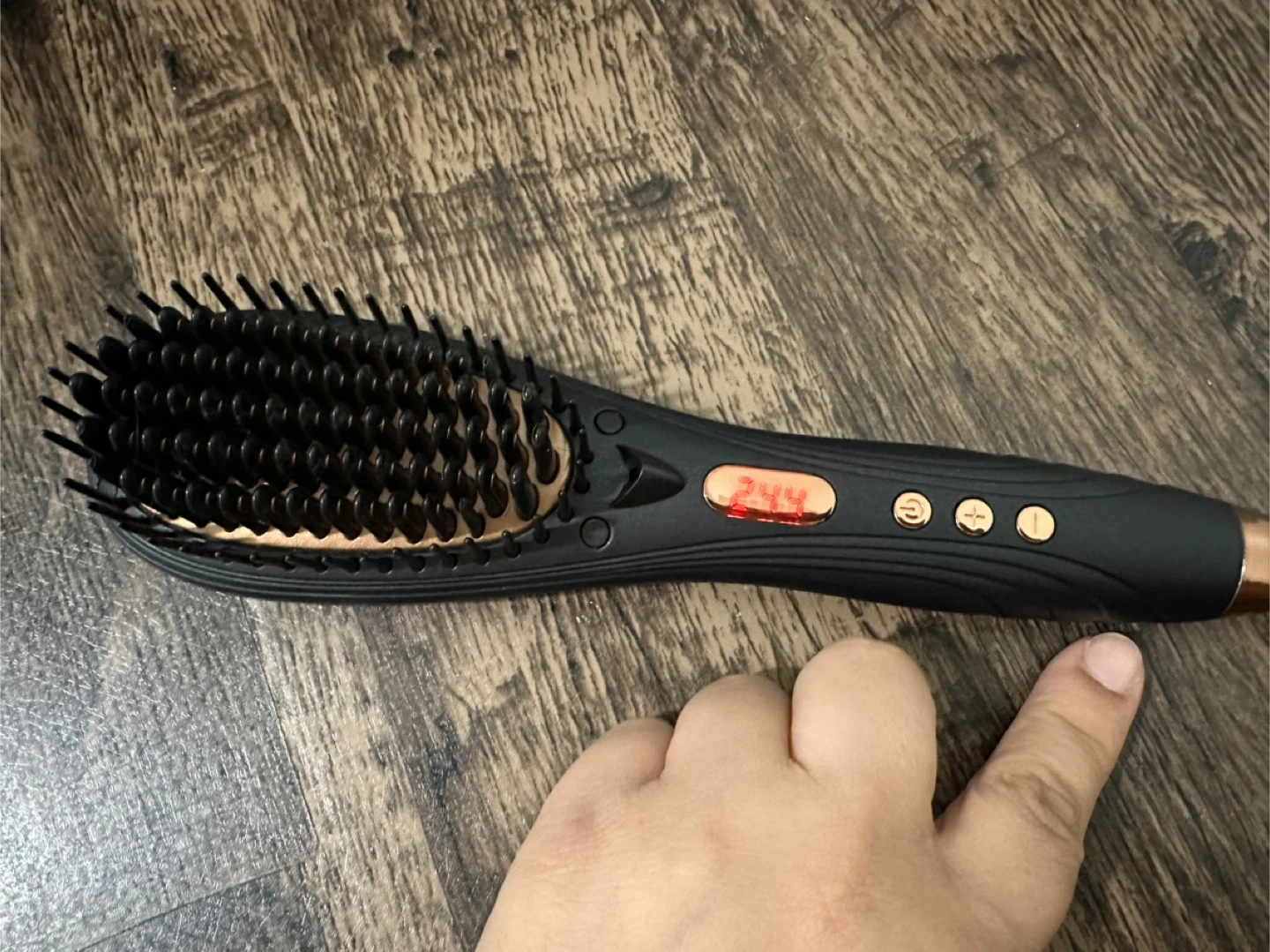 10Selling a hair straightener brush in great condition! It's black with gold accents. It has a digital display and buttons to control the temperature. It also has a long cord.